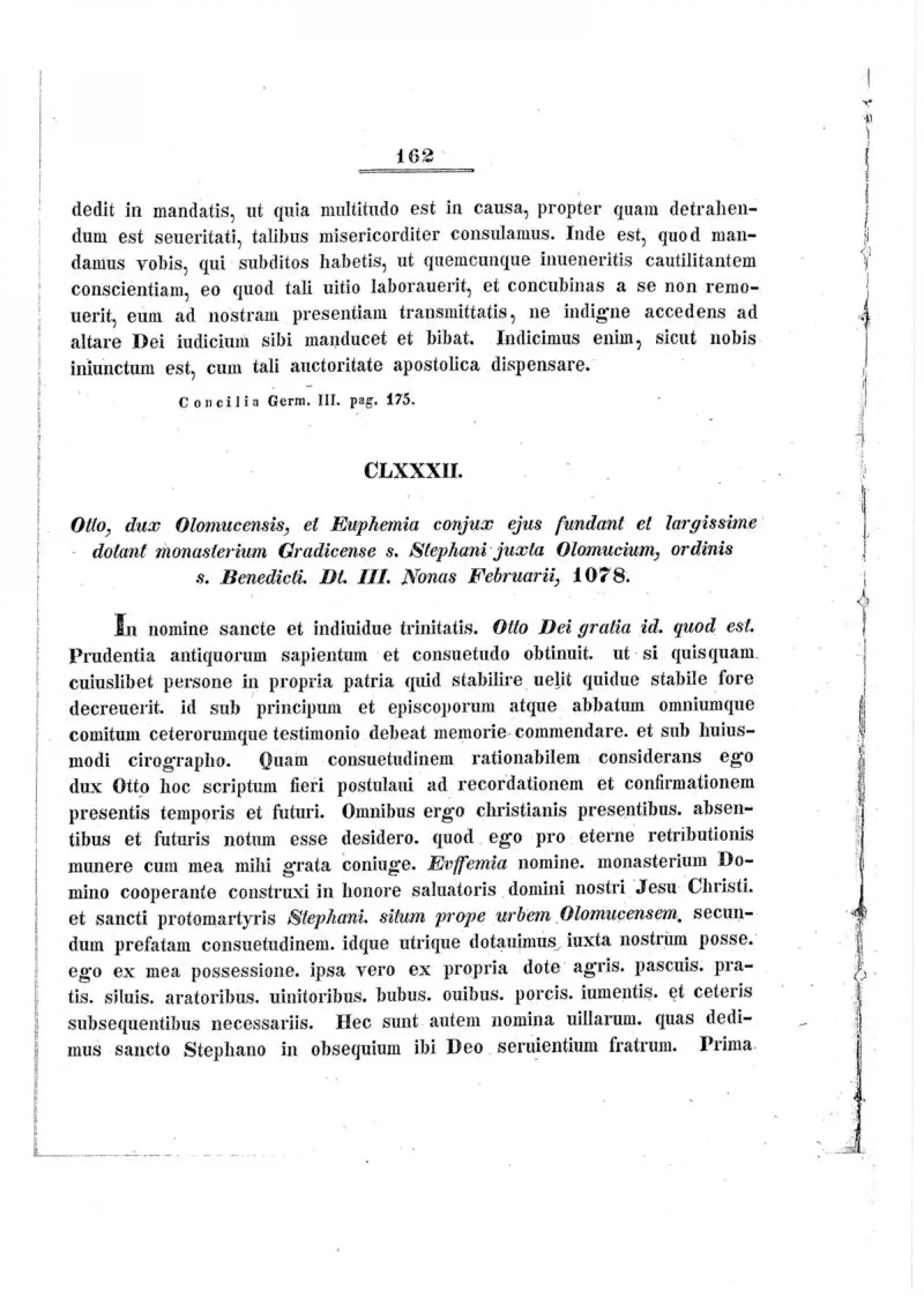 Codex diplomaticus et epistolaris Moraviae, Olomouc 1836, s. 162 – první strana Bočkovy edice fundační listiny benediktýnského kláštera Hradiska ze dne 3. února 1078.