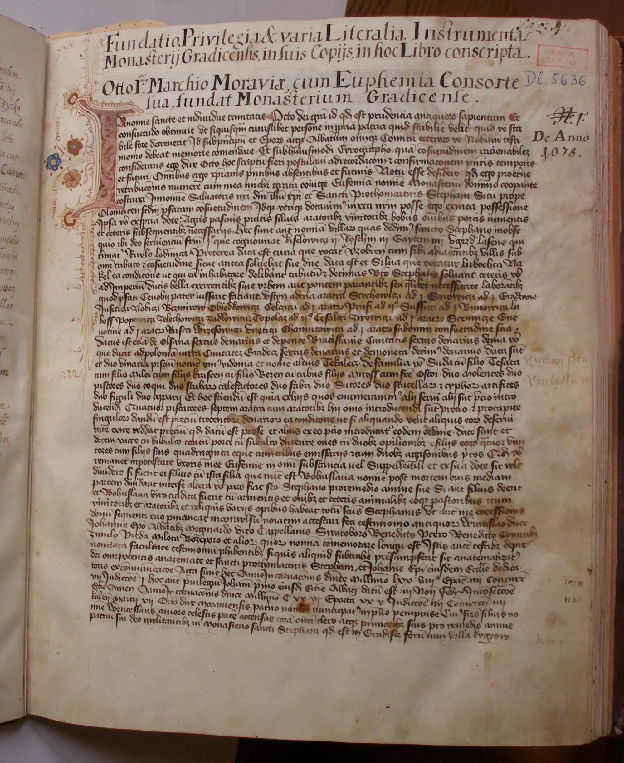 Opis fundační listiny benediktýnského konventu Hradiska u Olomouce vystavené olomouckým údělným knížetem Otou I. 3. února 1078. Opis byl pořízen mezi léty 1418–1432. Liber monasterii Gradicensis, archiv premonstrátského konventu v Csorné, Maďarská republika, pag. 1.