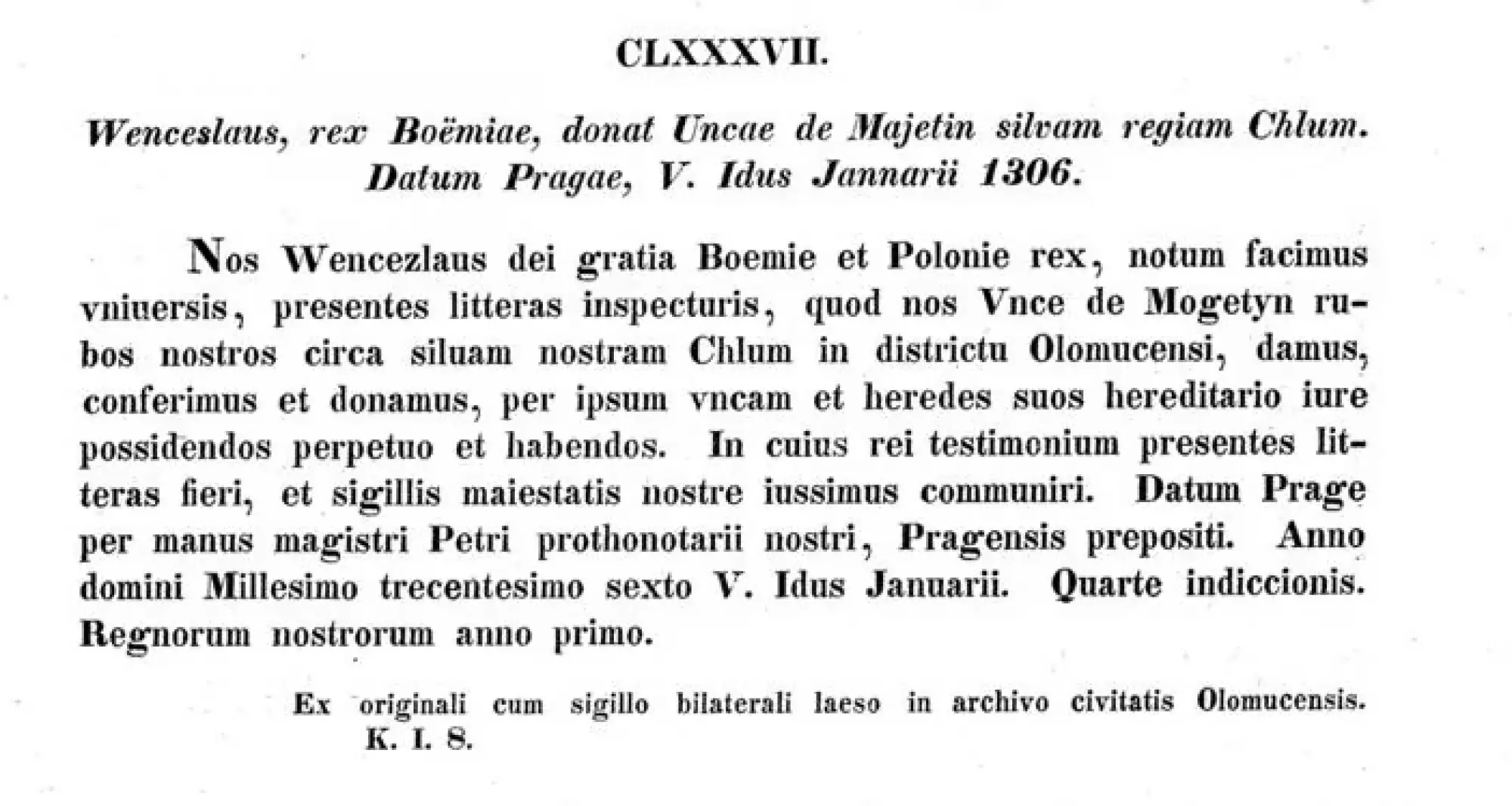 My Václav, z Boží milosti král český a polský, činíme známo všem nahlížejícím do této listiny, že Unkovi z Majetína dáváme, věnujeme a darujeme naše křoviska kolem našeho lesa Chlumu v olomouckém distriktu, aby je Unka a jeho dědicové jako právoplatné dědictví trvale vlastnili a měli. Na svědectví této věci jsme nechali zhotovit tuto listinu a rozkázali jsme ji opatřit pečetí našeho majestátu. Dáno v Praze rukou magistra Petra, našeho protonotáře, pražského probošta.1 Léta Páně 1306, o V. lednových idách,2 čtvrté indikce,3 Naší vlády roku prvního.