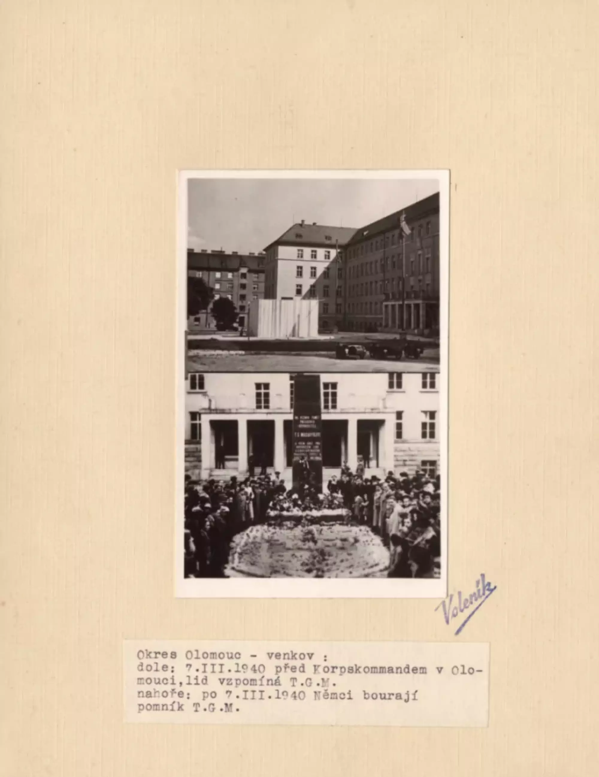 Likvidace nedokončeného pomníku prezidenta T. G. Masaryka německou správou města Olomouce po 7. březnu 1940. – Setkání občanů u nedokončeného pomníku prezidenta Tomáše G. Masaryka v Olomouci 24. dubna 1939.