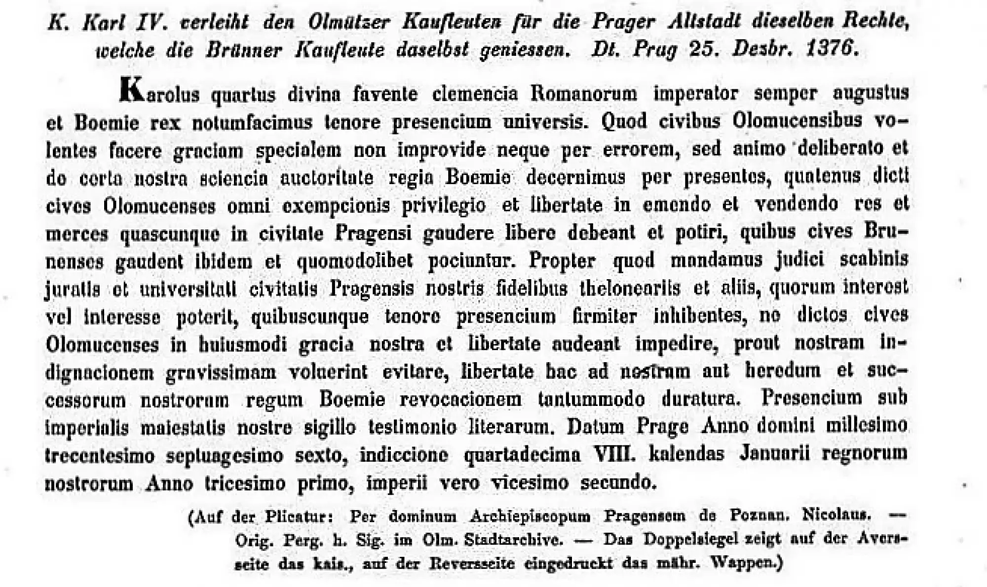 My Karel IV., z přízně Boží milosti římský císař, vždy rozhojnitel říše, a český král, touto listinou všem dáváme ve známost následující: Protože olomouckým občanům chceme prokázat zvláštní milost nikoliv neprozíravě nebo mylně, ale s rozvážným duchem a na základě naší spolehlivé znalosti, z autority českého krále touto listinou rozhodujeme, aby se řečení olomoučtí občané svobodně těšili všem privilegiím daňové výjimky a svobodě kupovat i prodávat jakékoliv majetky a zboží ve Městě pražském, jimž se tam rovněž těší občané brněnští a všemi způsoby jich užívají. Proto ukládáme rychtáři, šepmistrům,1 přísežným konšelům a univerzitě pražské obce, jakož i našim věrným celníkům a dalším, jichž se to týká nebo týkat může, a touto listinou všem v tom zabraňujeme, aby se neodvážili řečeným občanům olomouckým bránit v této naší milosti a svobodě, pokud se chtějí vyhnout naší nejtěžší nepřízni, a aby tato svoboda trvala, pokud nebude odvolána námi nebo našimi dědici a nástupci, českými králi. Na důkaz toho tento list opatřujeme pečetí našeho královského majestátu. Dáno v Praze léta Páně tisícího třístého sedmdesátého šestého, ve čtrnácté indikci,2 osmého dne před lednovými kalendami,3 třicátého prvního roku naší královské vlády, dvacátého druhého roku naší císařské vlády.