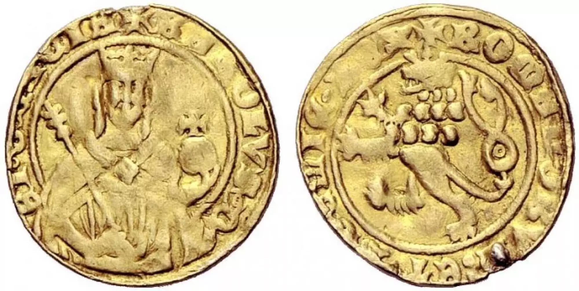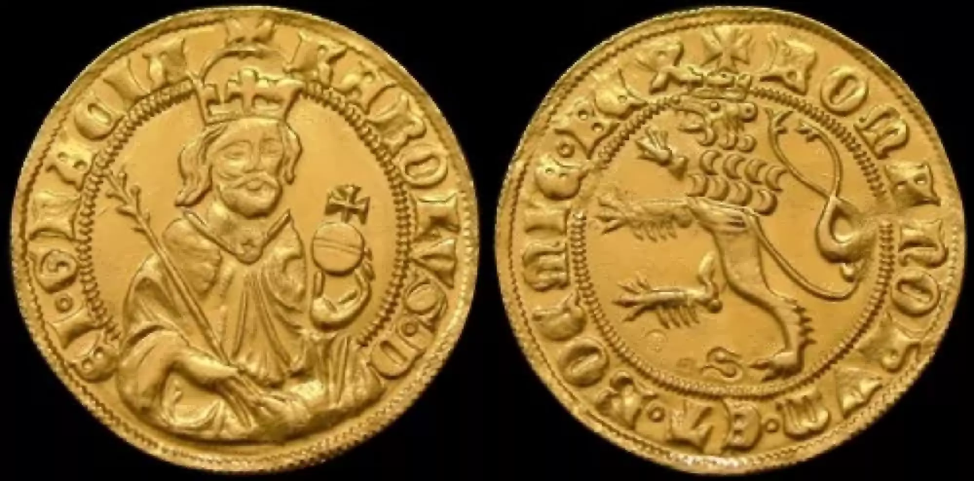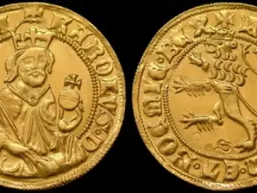 „Císařský“ typ dukátu Karla IV., ražený po roce 1355. Dukáty Karla IV. byly na rozdíl od dukátů jiných evropských vládců raženy pouze v malém množství, neboť přírodní zdroje zlata v jílovských a kašperský dolech byly velmi omezené. Averz dukátu nese autentické poprsí českého krále a římského císaře Karla IV. s císařskými insigniemi – korunovačními klenoty.