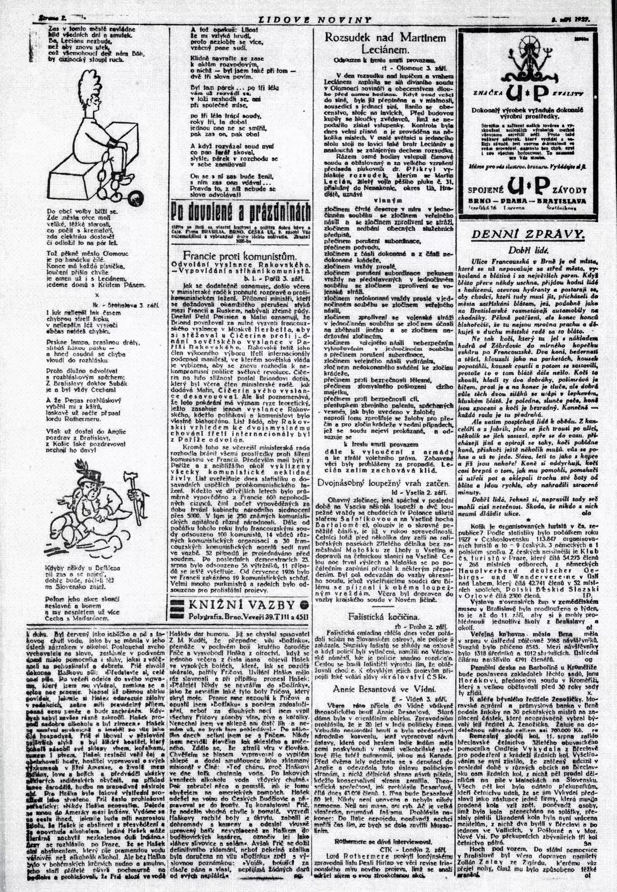 Lidové noviny ze dnů 1. září 1927 a 3. září 1927 se zpravodajstvím z procesu s Martinem Leciánem před olomouckým vojenským soudem a s „rozhláskem“ na toto téma od brněnského novináře a spisovatele Rudolfa Těsnohlídka (1882–1928).
