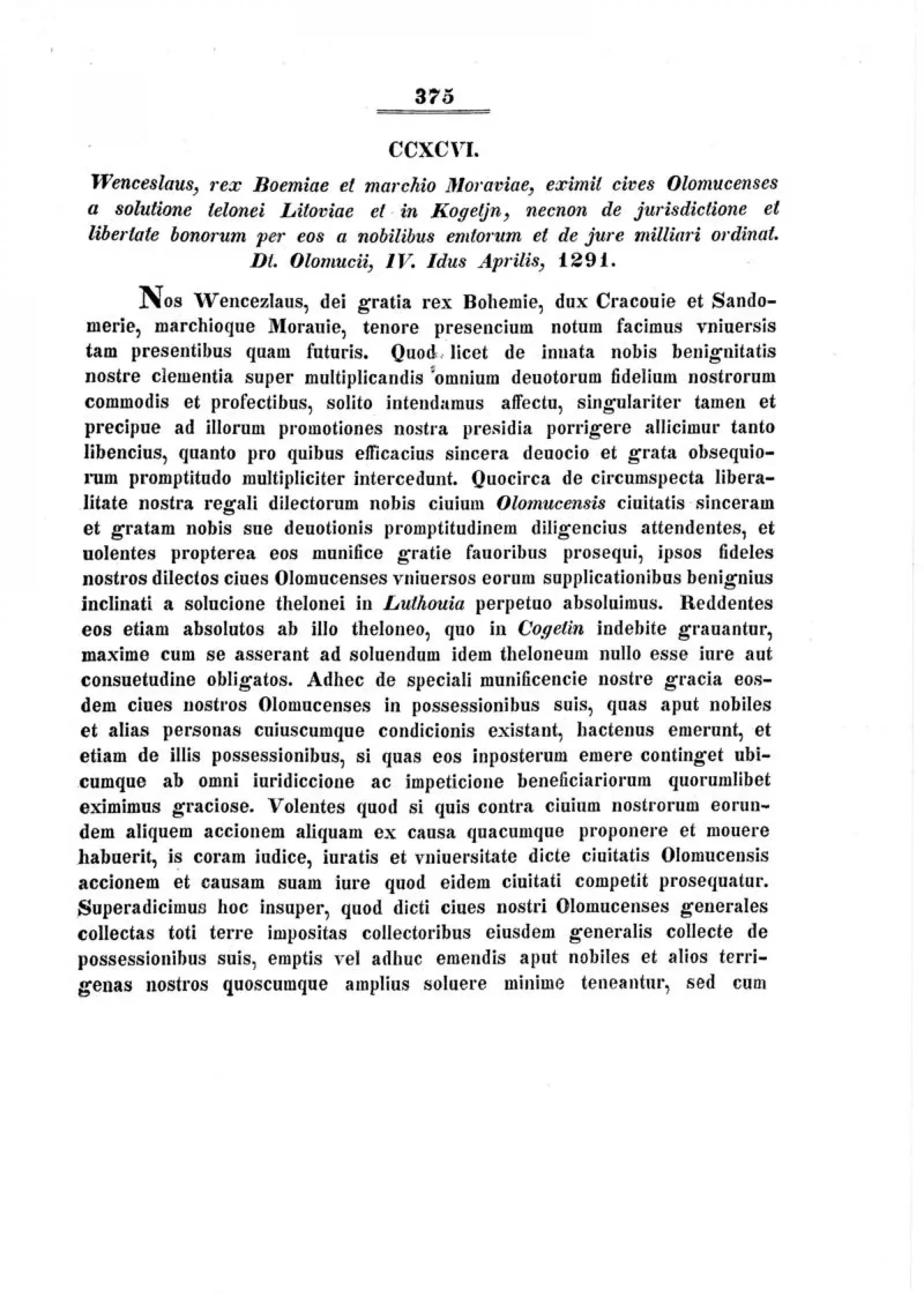 My, Václav, z Boží milosti král český, vévoda krakovský a sandomierzský, markrabě moravský, touto listinou dáváme ve známost všem současníkům i budoucím. Z nám vrozené naší dobrotivé milostivosti a s obvyklým zaujetím usilujeme o rozhojnění prospěchu a výhod svých poddaných a k jejich povznesení jsme puzeni poskytovat svou záštitu o to raději, čím více k tomu mnohonásobně přispívá jejich upřímná zbožnost a milostivá připravenost být nás vždy poslušni. A protože tedy z naší obvyklé královské štědrosti velmi horlivě poskytujeme svou pozornost vždy pohotové, upřímné a nám milé oddanosti našich milých olomouckých občanů vůči naší osobě, a chceme je proto štědře obdařit přízní své milosti, jsouce dobrotivě nakloněni jejich prosbám, tyto naše milé a věrné olomoucké občany navždy osvobozujeme od placení mýta v Litovli. Rovněž tak je prohlašujeme za osvobozené od mýta, jímž jsou nenáležitě zatíženi v Kojetíně, a to tím spíše, když sami tvrdí, že k placení tohoto mýta nejsou zavázáni žádným právem ni zvykem. Nadto ještě ze zvláštní milosti naší štědrosti týmž olomouckým občanům milostivě udělujeme výjimku v tom, že pokud něco z jejich majetků, co dosud zakoupili, pochází od šlechticů a dalších osob jakéhokoliv stavu, nebo pokud se stane, že by kdykoliv příště od nich cokoliv zakoupili, nechť jsou tyto majetky osvobozeny od veškeré jurisdikce a vymáhání [žaloby z pohledávky]. Rovněž tak si přejeme, aby pokud by někdo proti našim občanům z jakékoliv příčiny vyvolal a vedl právní řízení, nechť ono řízení probíhá před rychtářem, přísežnými konšely a veškerým shromážděním řečeného města Olomouce a svou při vede podle práva, které platí v tomto městě. Navíc ještě dodáváme, že řečení občané olomoučtí nejsou již více nikterak povinni všeobecné daně uložené celé zemi platit ze svých majetků, ať již koupených, nebo těch, které mají být zakoupeny u šlechticů a kterýchkoliv dalších zemanů, výběrčím této všeobecné daně, ale jen tehdy, když budou při jakékoliv příležitosti vypsány jiné dávky a poplatky či jakákoliv jiná služebná povinnost města Olomouce, pak řečení občané, kteří mají jakékoliv majetky zakoupené od šlechticů či jiných našich zemanů, ze svých majetků sobě uložené zmíněné daně, dávky a poplatky strpí a spolu s městem Olomoucí řádně zaplatí. Kromě toho z majetků zakoupených či majících být zakoupených od šlechticů a jakýchkoliv dalších osob nesmějí být vázáni k žádným jiným výdajům, než jaké mají ze svých majetků v prvním nájmu připojených k tomuto městu. Navíc, abychom ještě dovršili míru naší milostivosti, připojujeme a přejeme si následující, totiž aby žádný ze šlechticů a našich zemanů bezprávně nezadržoval žádného člověka, který by chtěl z jejich majetků přejít k řečenému městu a ani se ho nesnažil jakkoliv obtěžovat, nýbrž ho svobodně propustil. A pokud by se onen šlechtic nebo zeman pokusil vést nějaké právní řízení proti takovému člověku, nechť se tak děje před soudcem, přísežnými konšely a společenstvím občanů řečeného města Olomouce, kteří tam budou moci plně uplatnit své právo. Dále aby naši řečení milovaní a věrní občané z větší štědrosti naší velkorysosti požívali ještě dalších výhod, autoritou tohoto našeho privilegia všem a jednomu každému pevně a důrazně zakazujeme, aby se žádný z lidí neodvážil nebo nezamýšlel v celé šíři vzdálenosti jedné míle od města Olomouce vařit pivo. Na dosvědčení toho všeho a potvrzení platnosti této listiny jsme ji nechali důstojně opatřit oporou našich pečetí. A protože si přejeme, aby vše i jedno každé výše řečené nabylo platnosti a trvalo na věky, rozhodujeme taktéž touto listinou, aby nikdo z obročníků, rychtářů a úředníků a kterýchkoliv věrných poddaných moravské země se neodvážil jakýmkoliv způsobem narušit poskytnuté výsady či v pošetilé troufalosti proti nim jakkoliv jinak vystupovat. Pokud by se kdokoliv pokusil proti nim jakkoliv jednat, nechť pocítí naši těžkou nepřízeň vedoucí k jeho zavržení. Dáno v Olomouci skrze ruce mistra Jana, probošta ze Sadské, našeho protonotáře moravského, léta Páně tisícího dvoustého devadesátého prvního, čtvrtého dne před dubnovými Idami,1 ve čtvrté indikci.2