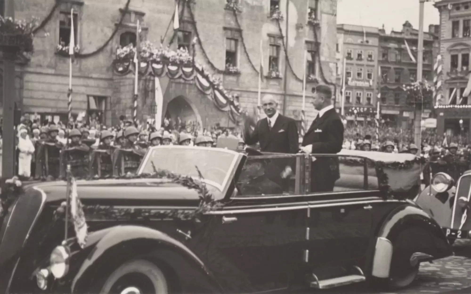 V srpnu roku 1937 podnikl prezident Beneš reprezentativní cestu na Moravu, během níž navštívil zejména Slováckou výstavu v Uherském Hradišti a rovněž Olomouc. Moravská cesta dr. Beneše byla zahájena se všemi protokolárními poctami na pražském Willsonově nádraží v neděli 22. srpna 1937 v 7 hodin ráno, zvláštním vlakem prezident s doprovodem odcestoval přes Českou Třebovou, Olomouc a Přerov do Uherského Hradiště. Po prohlídce Slovácké výstavy odjela prezidentova choť Hana Benešová do Sezimova Ústí, zatímco Edvard Beneš v 17 hodin pokračoval v cestě do Olomouce, jehož byl od 14. září 1936 čestným občanem. Na olomoucké hlavní nádraží dorazil zvláštní vlak v 17 hodin 45 minut; za zvuků pochodu se uvítání ujali ministr národní obrany František Machník, olomoucký starosta JUDr. Rudolf Fischer a okresní hejtman JUDr. Alexander Menčík. Nemohla ovšem chybět dvě děvčata v hanáckých krojích, jež předala prezidentovi kytici se slovy „Pěkně vás vítáme!“.