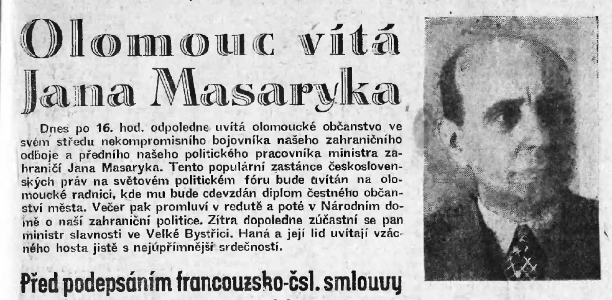 Ve dnech 24.–25. května 1947 podnikl nestranický ministr zahraničních věcí první vlády ČSR premiéra Klementa Gottwalda (KSČ) Jan Masaryk cestu kolonou vládních automobilů na Moravu. Nejprve, a to v sobotu 24. května, navštívil Olomouc. O průběhu pobytu Jana Masaryka v Olomouci informují dobové noviny – komunistická Stráž lidu a lidovecký Osvobozený našinec, jakož i dochovaný amatérský film.