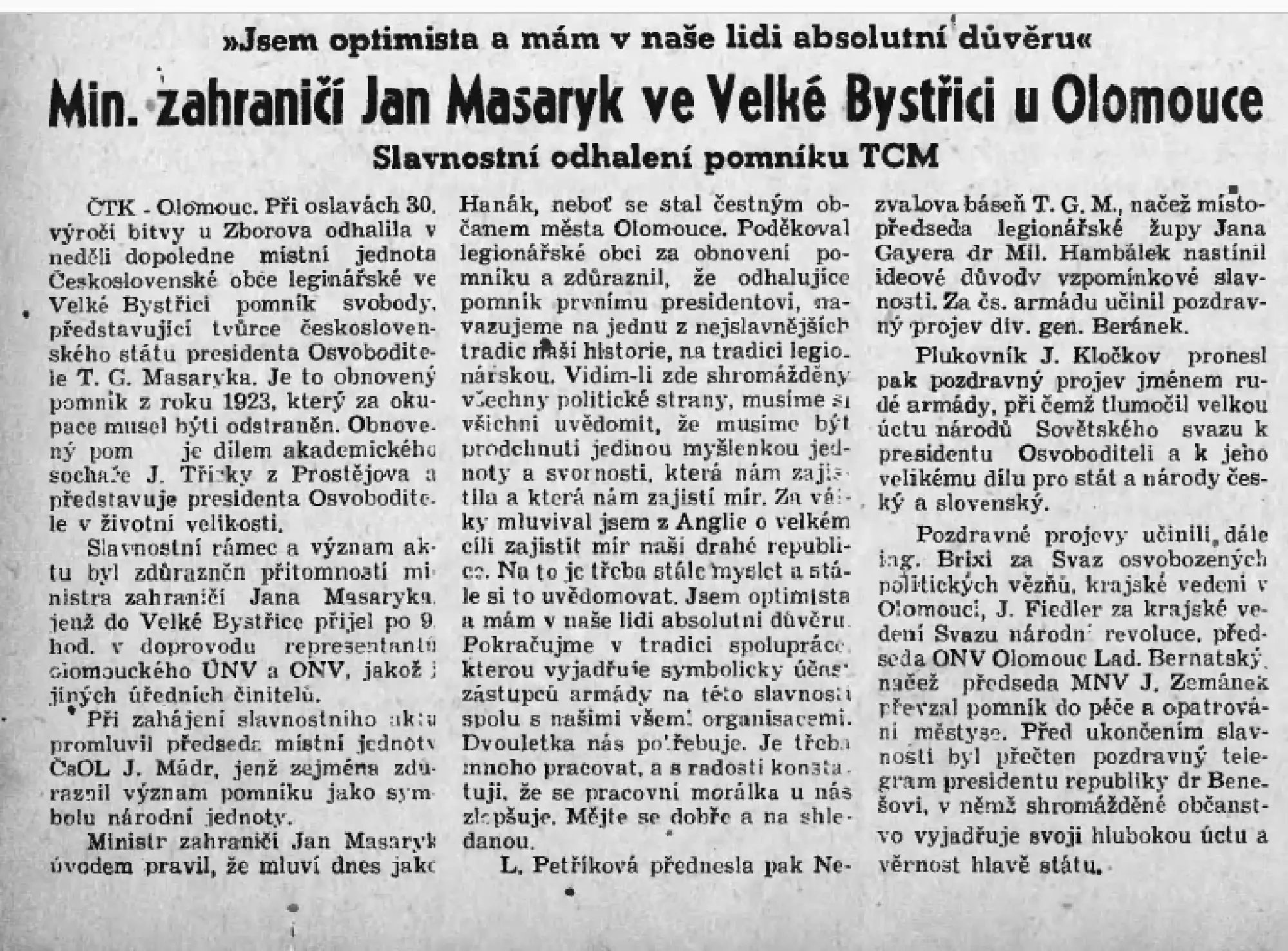 Odhalení pomníku Tomáše Garrigua Masaryka ve Velké Bystřici v 9 hodin dopoledne dne 25. května 1947 byl přítomen ministr Jan Masaryk, průběh slavnosti je zachycen v dobovém tisku a v dochovaném amatérském filmu. Sochu před základní školou TGM ve Velké Bystřici pořídili legionáři a pokrokové spolky po první světové válce jako sochu Svobody. Sochař Čeněk Palík z nedalekých Tršic zhotovil z hořického pískovce pomník v nadživotní velikosti, vysoký přes tři metry. Pomník byl odhalen 20. května 1923.