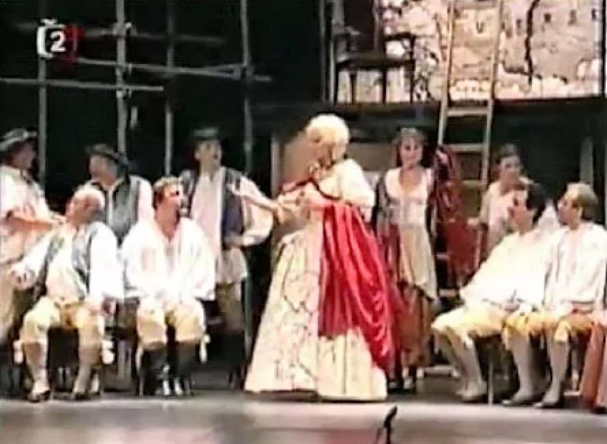 „Pro potěšení Veličenstev byl našimi úředníky v hanácké kroje oblečenými a studenty a písaři též hanácky oděnými proveden tanec hanácký... Byla provedena hanácká opera Querrella contra Borussum (tj. Žaloba na Prusa – Pargamotéka?). Když byla obě Veličenstva přivedena do opatského sálu, započala opera za četné a nejslavnější hudby. Všichni hudebníci byli hanácky oblečeni a jednající osoby byly v šatu hanáckém mužském a jiné v ženském. V meziaktí byl zase tanec hanácký, provedený úřednicemi... Po této opeře koncertoval houslista oblečený v hanáckém ženském šatě.“
