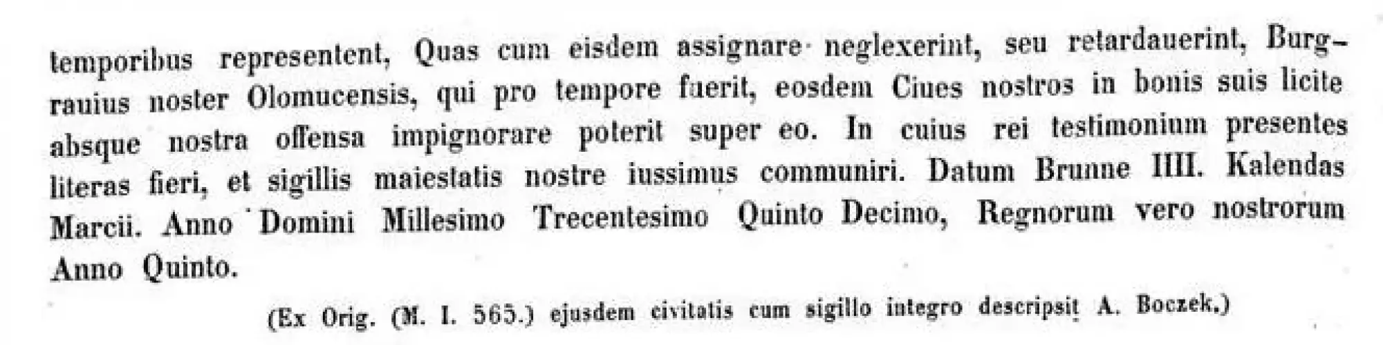 My, Jan, z Boží milosti král český a polský a hrabě lucemburský, dáváme všem ve známost, že laskavě usilujeme o rozhojňování blaha a prospěchu obcí a měšťanů našeho království, jak to sluší královské Výsosti a jak nám radí mírnost nám vrozené dobrotivosti. Našim olomouckým měšťanům ze své královské štědrosti převádíme a darujeme mýto řečeného města, které dosud příslušelo k našemu hradu, aby je takto mohli spravovat k blahu a prospěchu svému a svého města, a tímto výnosem jim dále poskytujeme plnou pravomoc v tom, aby řečené mýto mohli zcela nebo zčásti jakkoliv odpouštět, měnit a umenšovat. Připojujeme k tomu však podmínku, aby titíž naši olomoučtí měšťané namísto řečeného mýta našemu olomouckému purkrabímu a dalším, kdo byli zvyklí toto mýto dosud vybírat, v jednotlivých letech v oktávu svatého Martina1 předali osm hřiven moravské mince, a to na věčné časy. Pokud by však toto zanedbali nebo se opozdili, náš olomoucký purkrabí, který bude toho času v úřadě, může kvůli tomu svobodně, aniž by se nám tím protivil, těmto olomouckým měšťanům vzít do zástavy jejich majetek. Jako svědectví o tomto jsme nařídili vystavit tuto listinu a opatřit ji pečetí Našeho Majestátu. Dáno v Brně čtvrtého dne před březnovými kalendami léta Páně tisícího třístého patnáctého,2 v pátém roce naší královské vlády.