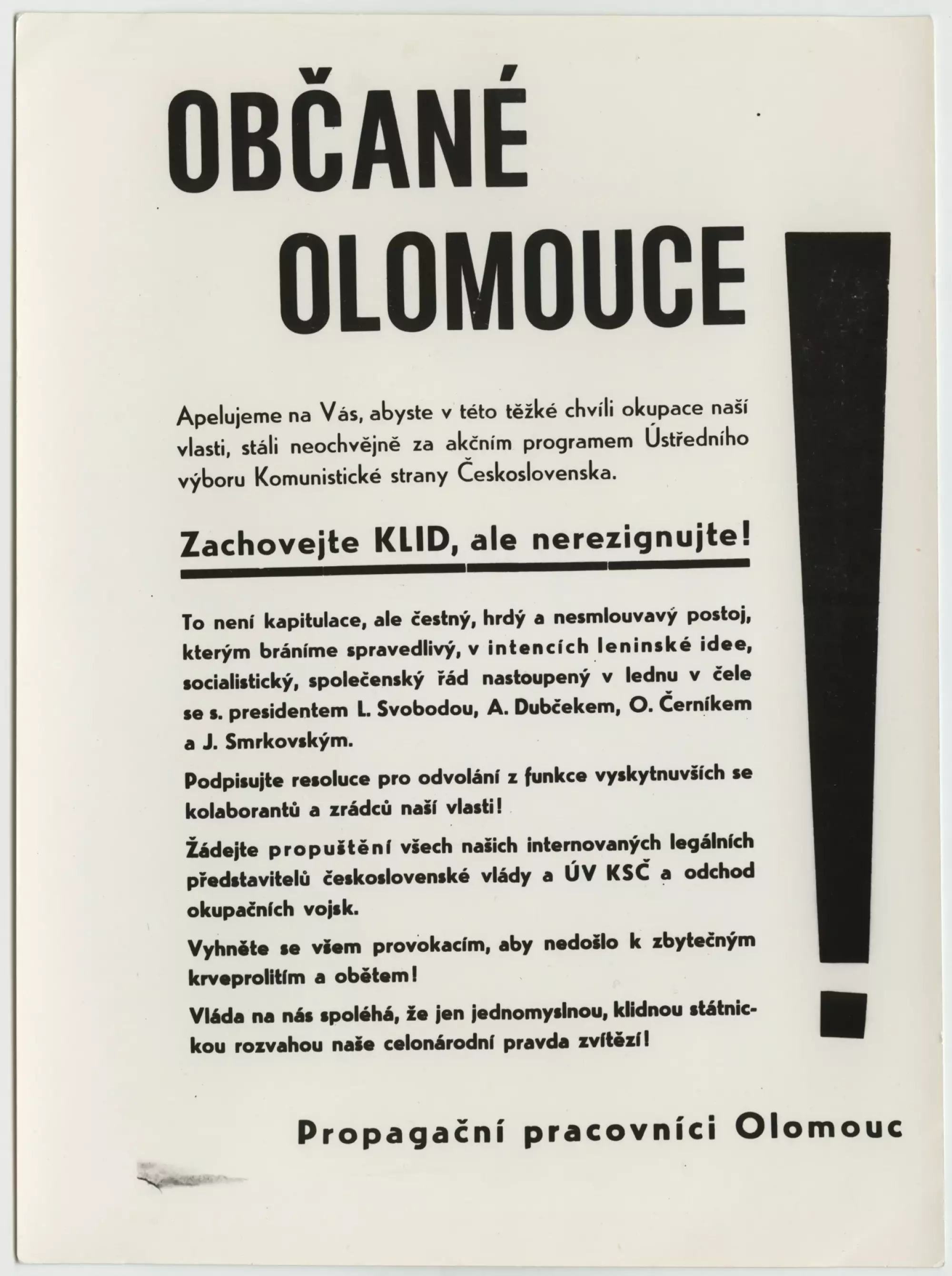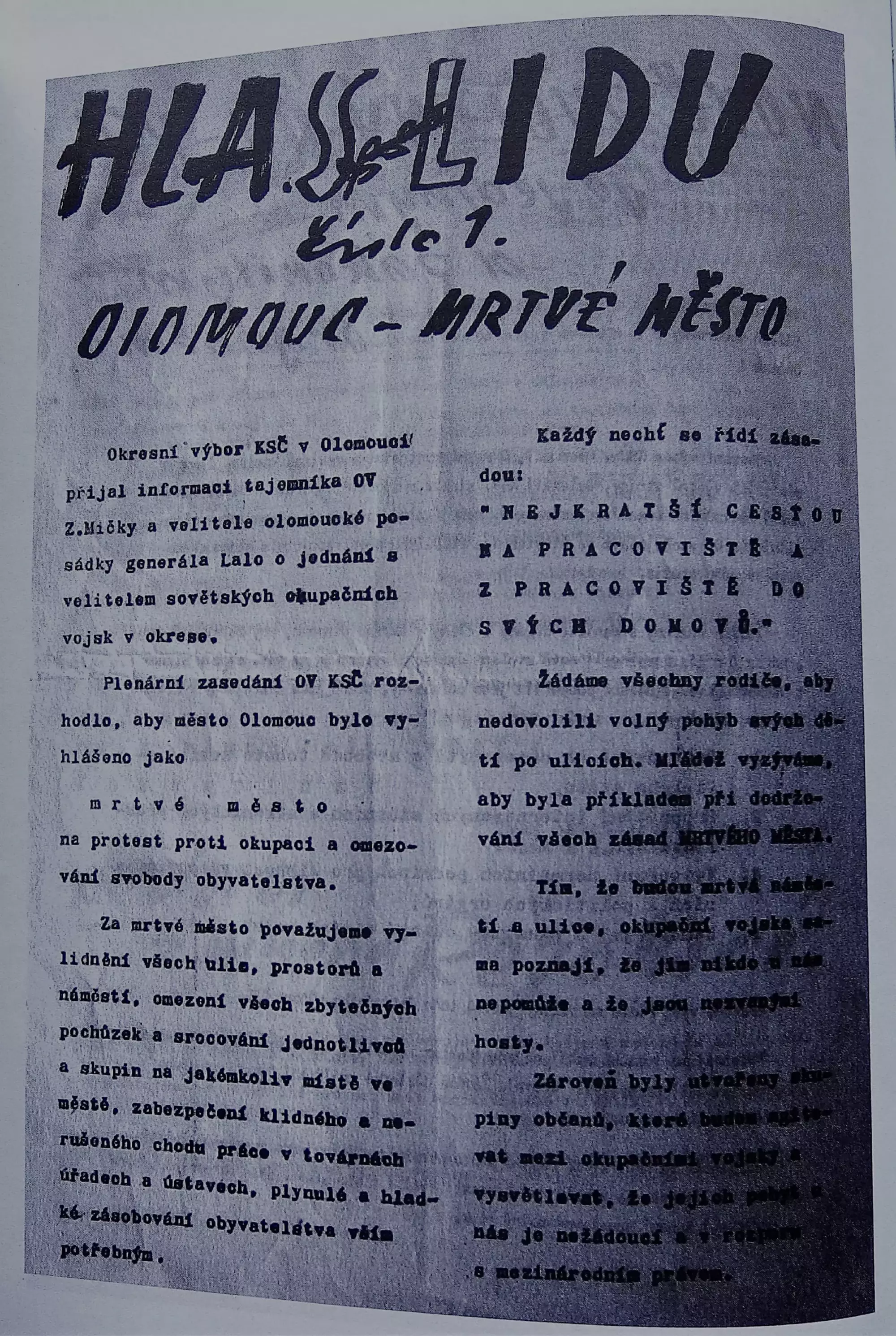 Tajemník OV KSČ Zdeněk Mička a předseda Okresního národního výboru v Olomouci Bohumil Macek byli sovětskými důstojníky donuceni přečíst do městského rozhlasu z budovy radnice rozkaz velitele sovětských vojsk dislokovaných v Olomouci, plukovníka N. S. Kuprijenka, o vyhlášení výjimečného stavu v Olomouci. Na základě jednání československých generálů přítomných v Olomouci – generálmajora Juraje Lalo, velitele silničního vojska Ministerstva národní obrany ČSSR a velitele olomoucké posádky, a jeho zástupce, generálmajora Michala Kričfalušiho (oba sloužili během 2. světové války v 1. československém armádním sboru v SSSR), upustil plukovník Kuprijenko od zákazu vycházení v nočních hodinách. Plenární zasedání OV KSČ nato rozhodlo, aby Olomouc byla vyhlášena na protest proti okupaci a omezování svobody obyvatelstva za „mrtvé město“, čímž se rozumělo „vylidnění všech ulic, prostorů a náměstí, omezení všech zbytečných pochůzek a srocování jednotlivců a skupin na jakémkoliv místě ve městě, zabezpečení klidného a nerušeného chodu práce v továrnách, úřadech a ústavech, plynulé a hladké zásobování obyvatelstva vším potřebným“. Provolání OV KSČ bylo v sobotu 24. srpna zveřejněno v 1. čísle letákových novin Hlas lidu – „zvláštního listu všech pokrokových občanů“. Vyšlo čtyřstránkové číslo obdeníku Stráž lidu, ale na přípravu dalšího čísla byla uvalena okupační cenzura: „Na velitelství, kam se musí nosit obtahy, sedí Ukrajinec a překládá veliteli. Kde je slovo Dubček, škrtá se článek hned.“ V 10 hodin dopoledne byla před budovou Vlastivědného ústavu (nyní Vlastivědného ústavu) v Olomouci na náměstí Republiky 6 uspořádána podpisová akce na podporu legálních stranických a státních orgánů ČSSR; po rozhlasové výzvě však byla tato akce ukončena. Stanice D–C–ABX vysílala v sobotu v 17.30 zprávu s odvoláním na vyprávění nejmenovaného sovětského důstojníka, že v olomouckém krematoriu byly zpopelněny tělesné pozůstatky sovětských vojáků, kteří zahynuli při dopravní nehodě, ale že sovětské velení vydalo oficiální zprávu, že byli zavražděni československými kontrarevolucionáři.