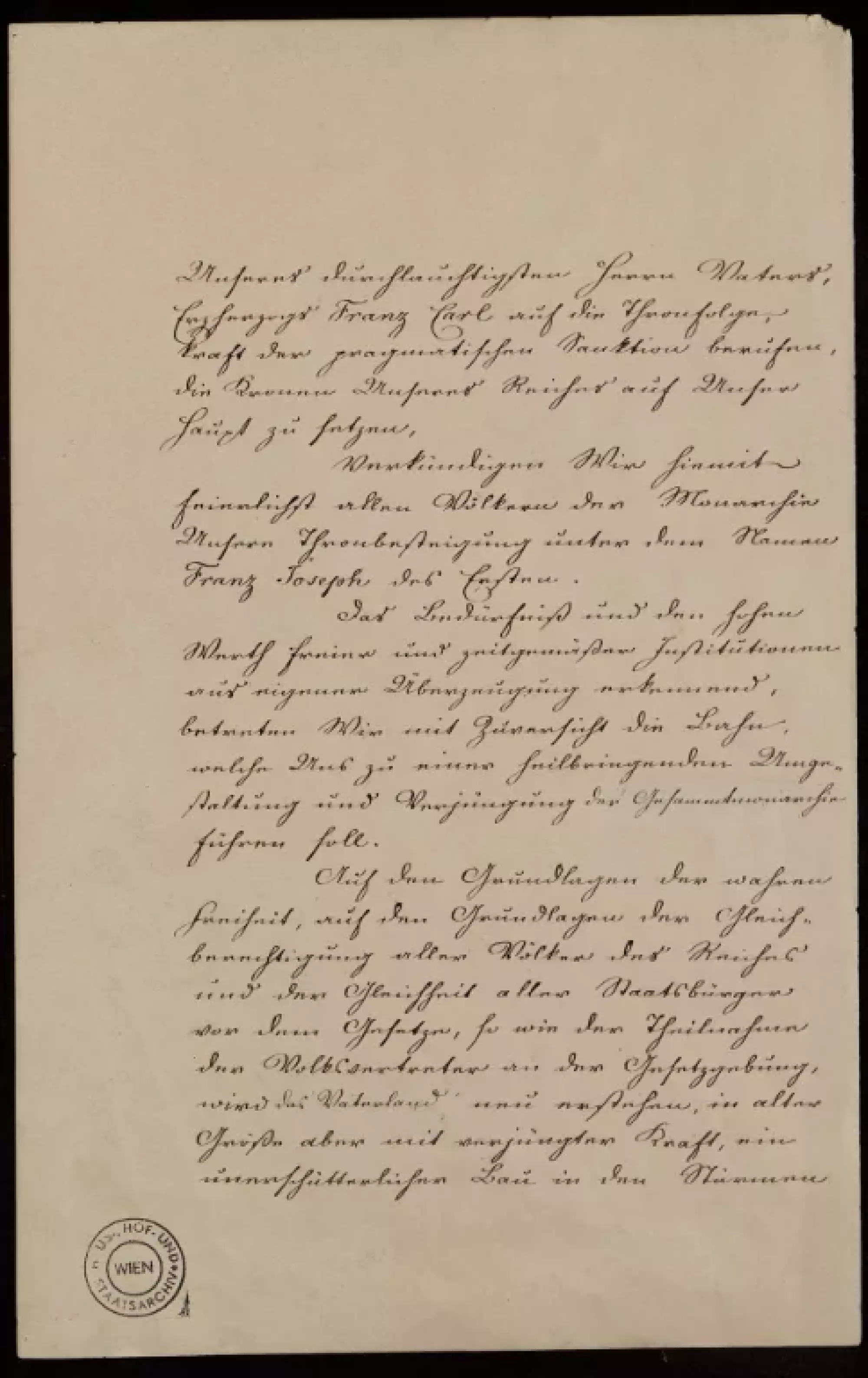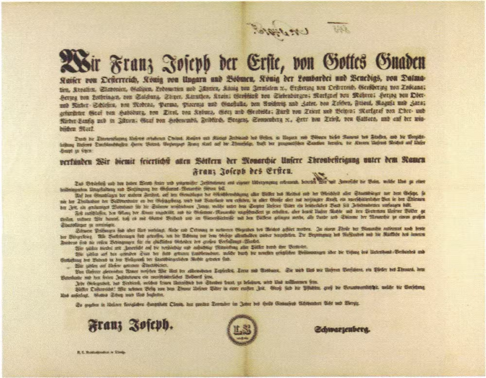 Durch die Thronentsagung Unseres erhabenen Oheims, Kaisers und Königs Ferdinand des Ersten, in Ungarn und Böhmen dieses Namens des Fünften, und die Verzichtleistung Unseres durchlauchtigsten Herrn Vaters, Erzherzogs Franz Carl auf die Thronfolge, kraft der pragmatischen Sanktion berufen die Kronen Unseres Reiches auf Unser Haupt zu setzen: verkündigen Wir hiemit feierlichst allen Völkern der Monarchie Unsere Thronbesteigung unter dem Namen Franz Joseph des Ersten.