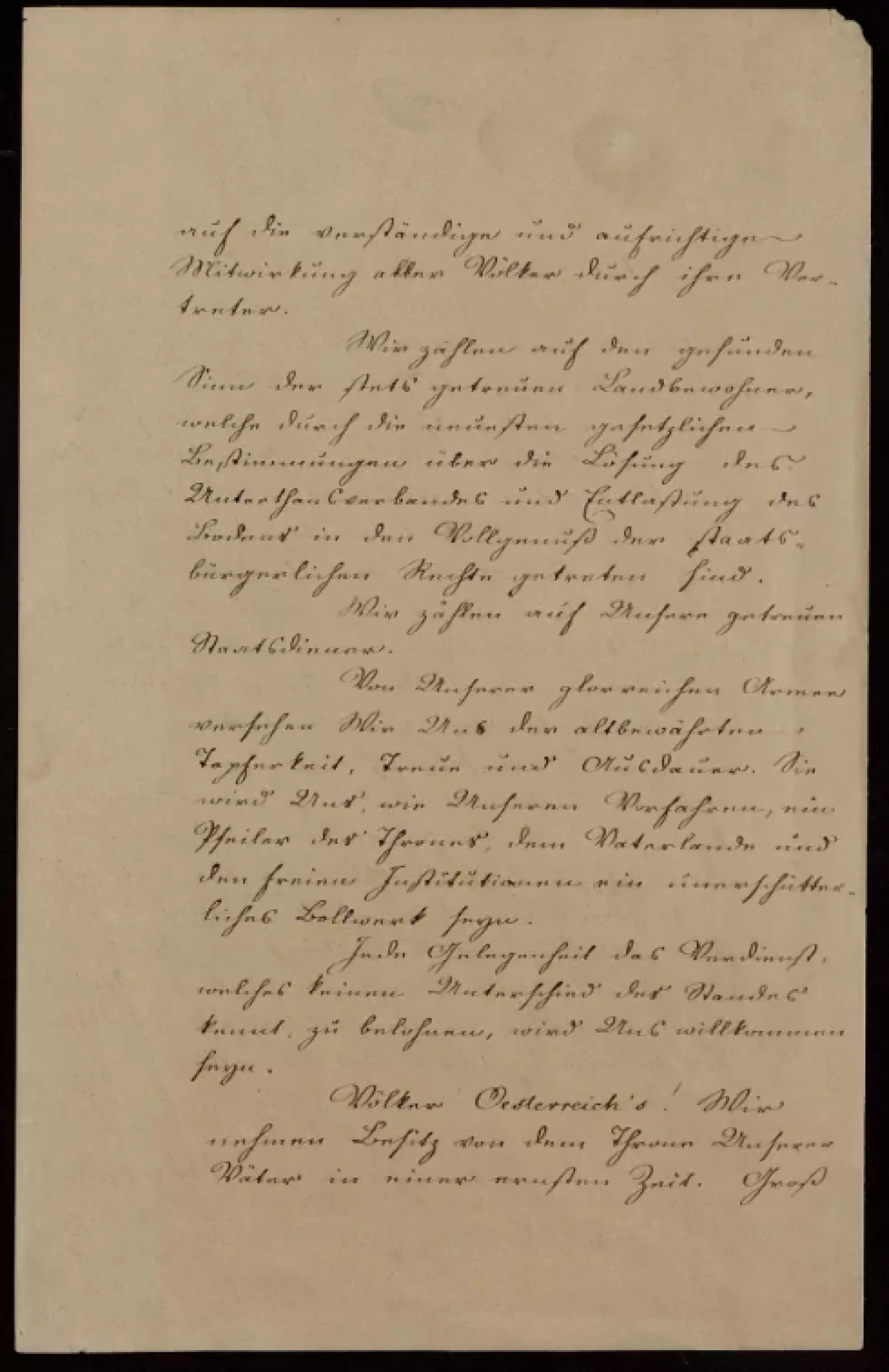 Das Bedürfnis und den hohen Werth freier und zeitgemäßer Institutionen aus eigener Überzeugung erkennend, betreten Wir mit Zuversicht die Bahn, welche Uns zu einer heilbringenden Umgestaltung und Verjüngung der Gesammtmonarchie führen soll.