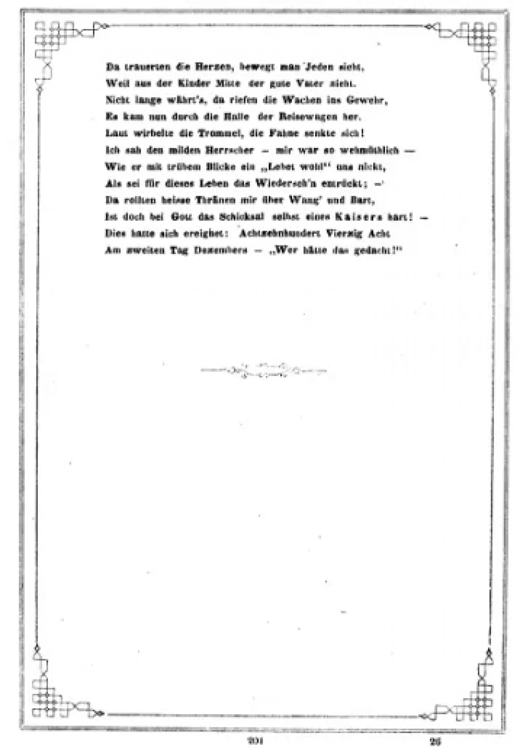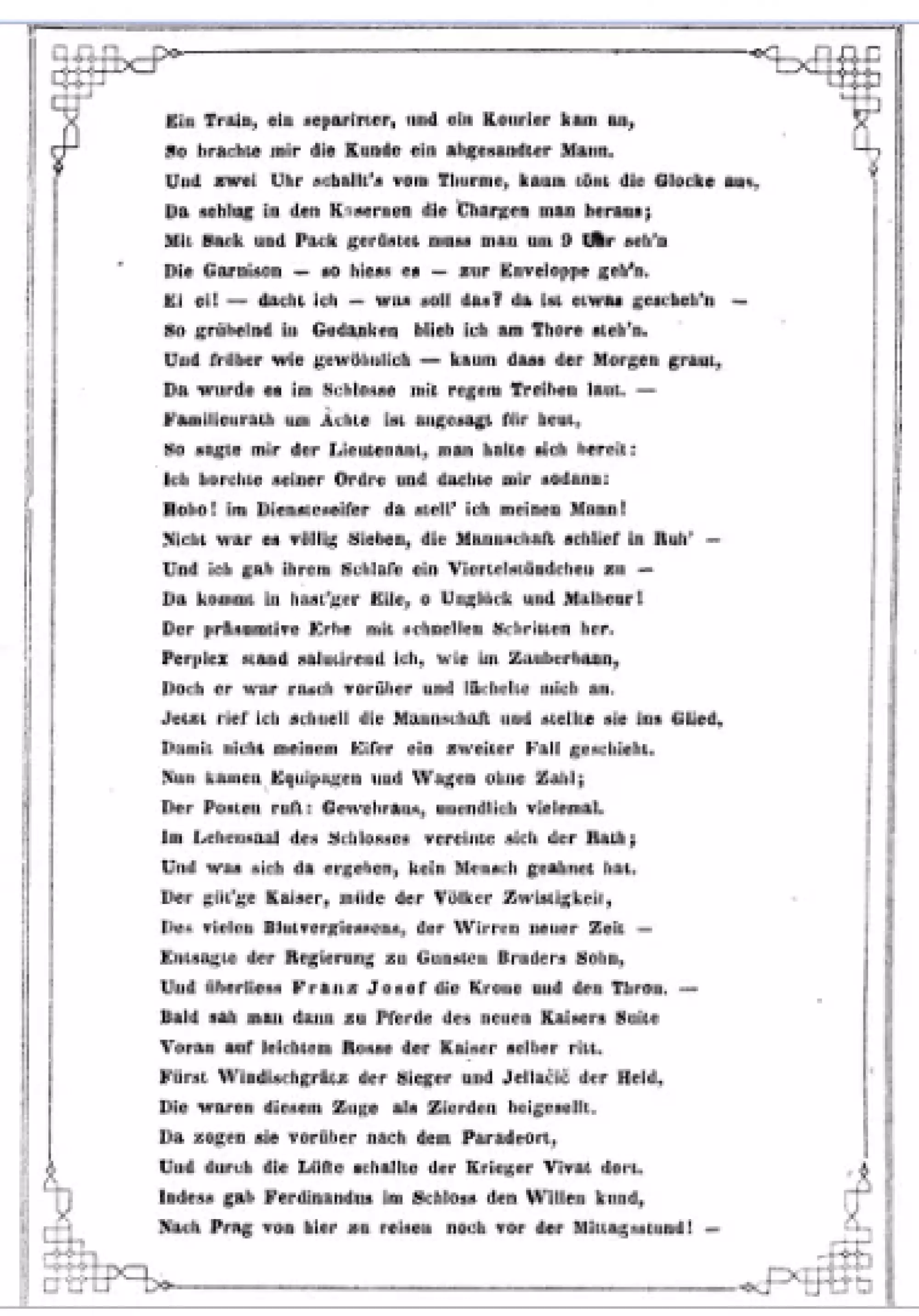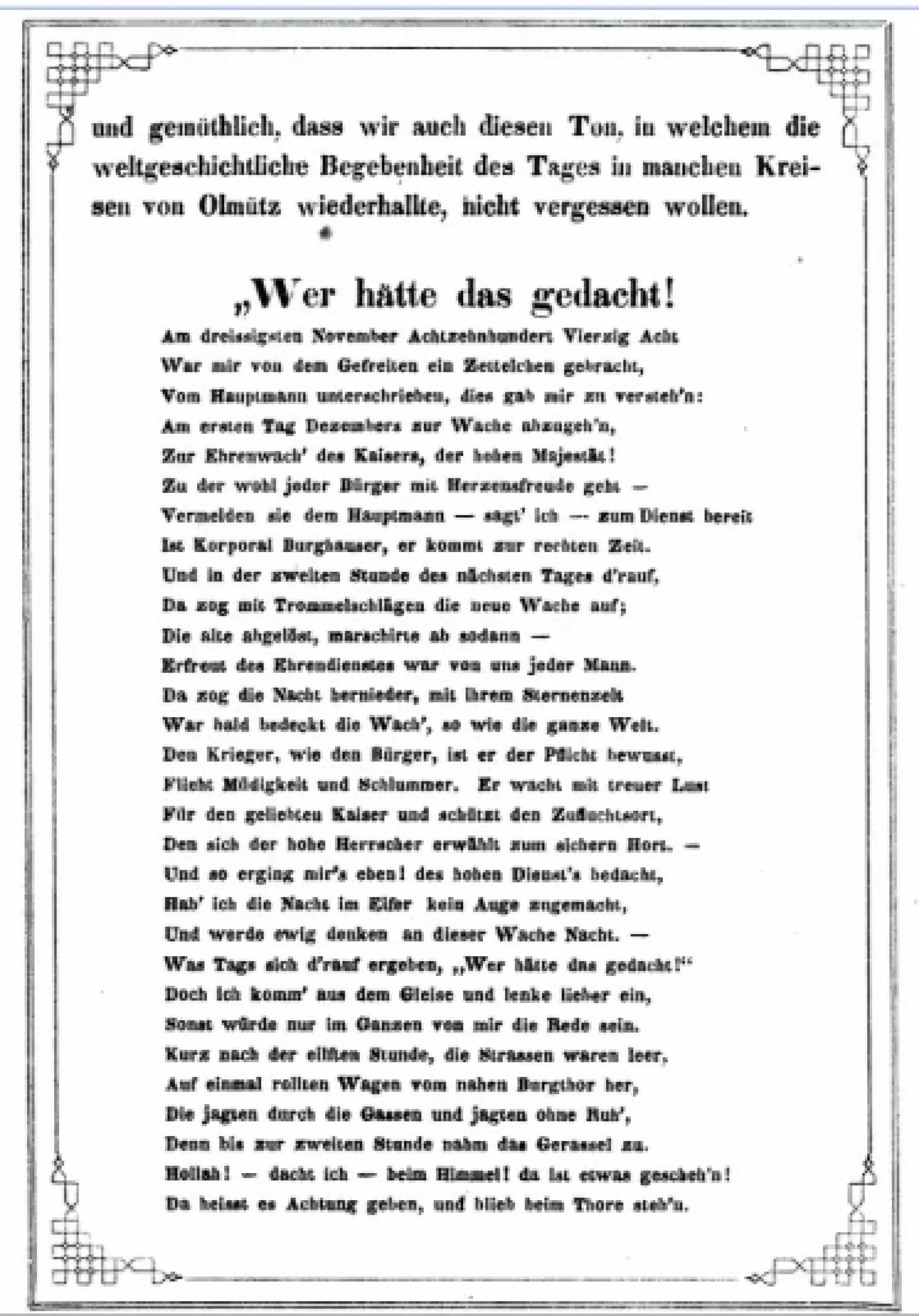 „Jeden olomoucký měšťan – píše polní podmaršálek Heinrich Sunstenau svobodný pán von Schützenfeld ve své knize Olmütz im Jahre 1848 – „vykreslil 2. prosinec v lidové improvizaci psané na strážnici s takovou naivitou, dobromyslností a bodrostí, že bychom rovněž tento tón, jímž se světodějné události onoho dne odrazily v mnohých olomouckých kruzích, neměli opomenout.“ Sunstenau proto otiskuje zmíněné německé veršování, o jehož český překlad jsme se pokusili. Jak plyne z osmého verše, autorem výplodu je tehdejší ředitel olomouckého městského divadla Karl Burghauser (1801–1857). Ten vedl olomoucký stánek múz tak úspěšně, že si z jeho výnosu mohl roku 1847 koupit honosný dům U Zeleného orla (Dolní nám. 19), postavený mezi lety 1619–1632 a ozdobený erby Václava Morkovského ze Zástřizl a jeho ženy Alžběty Eusebie Pruskovské z Pruskova.