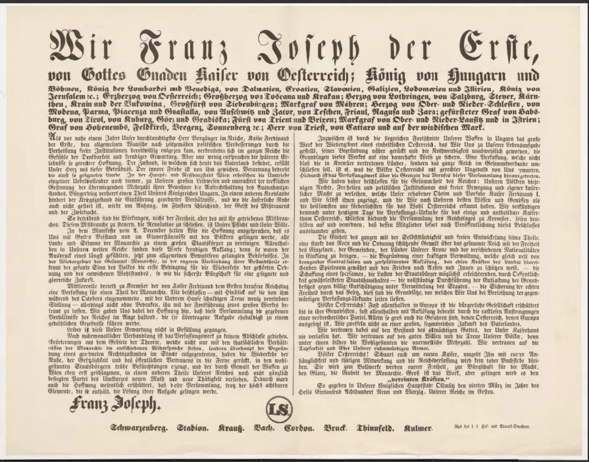 Tak žalostní jsou následkové, nikoli svobody, nýbrž prováděného s ní zlého užívání. Tomuto zlému užívání aby se hráz položila, revoluce aby se uzavřela, jest Naše povinnost i vůle Naše. V manifestu ode dne 2. prosince vyslovili jsme naději, že se nám podaří s pomocí Boží a ve srozumění s národy spojiti všecky země a národy Našeho mocnářství v jedno veliké státní tělo. Všude po rozlehlých našich říších nalezla slova tato radostného ohlasu, neboť byla výrazem potřeby ode dávna cítěné, nyní v obecné uvědomění přišlé. Ve znovuzrození veškerého mocnářství, v užším spojení jeho částek shledává zdravý smysl lidu první základ navrácení se zrušeného pořádku a pominulého blahobytu, jakož i nejpevnější rukojemství požehnané a slavné budoucnosti.