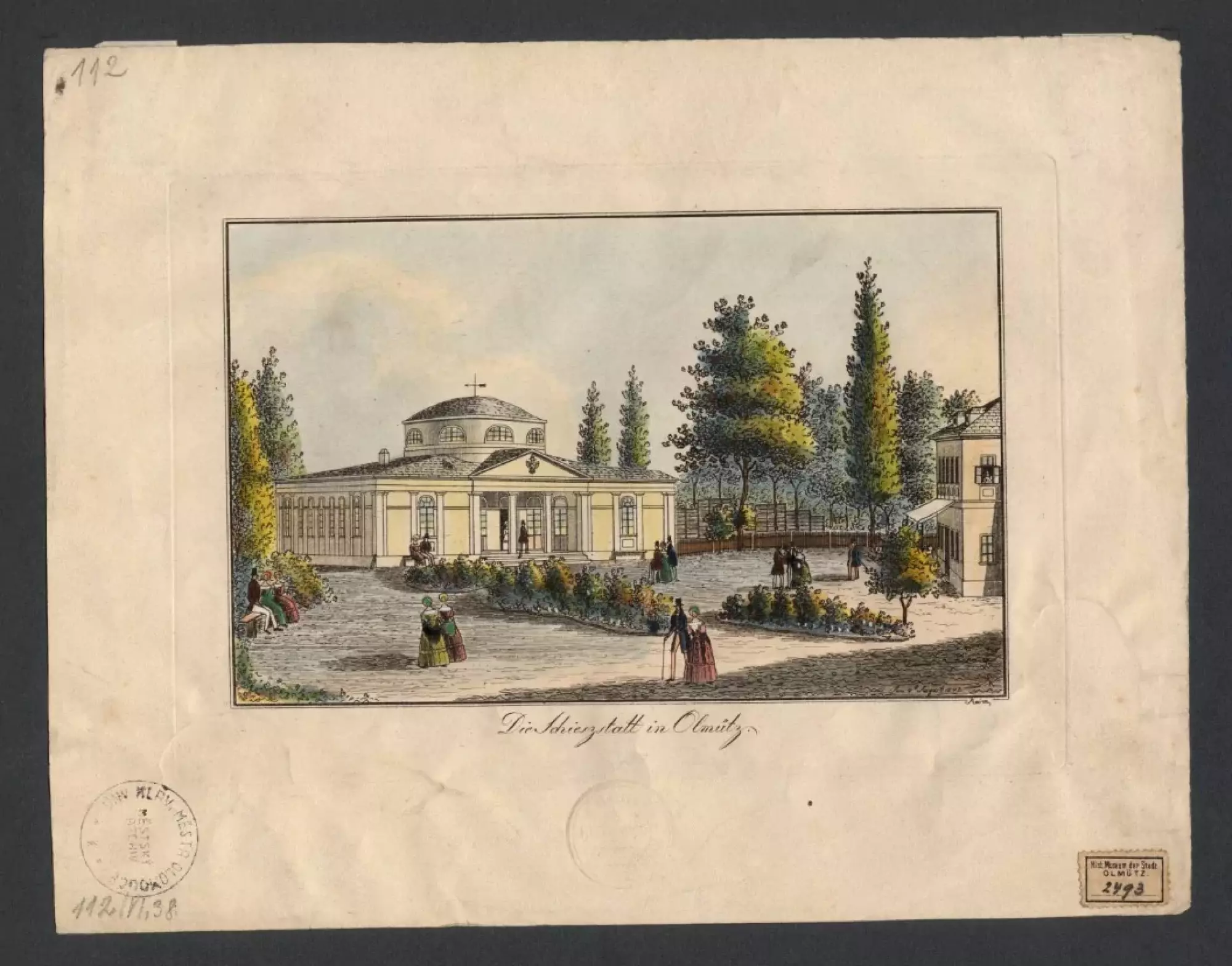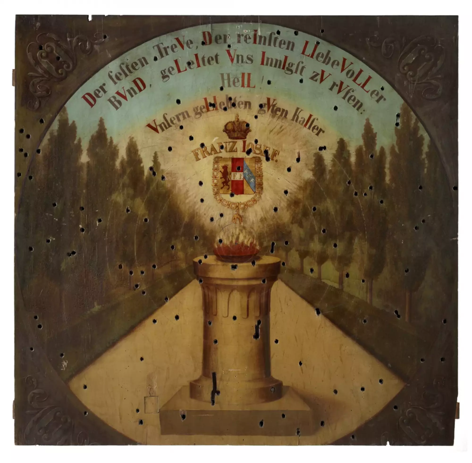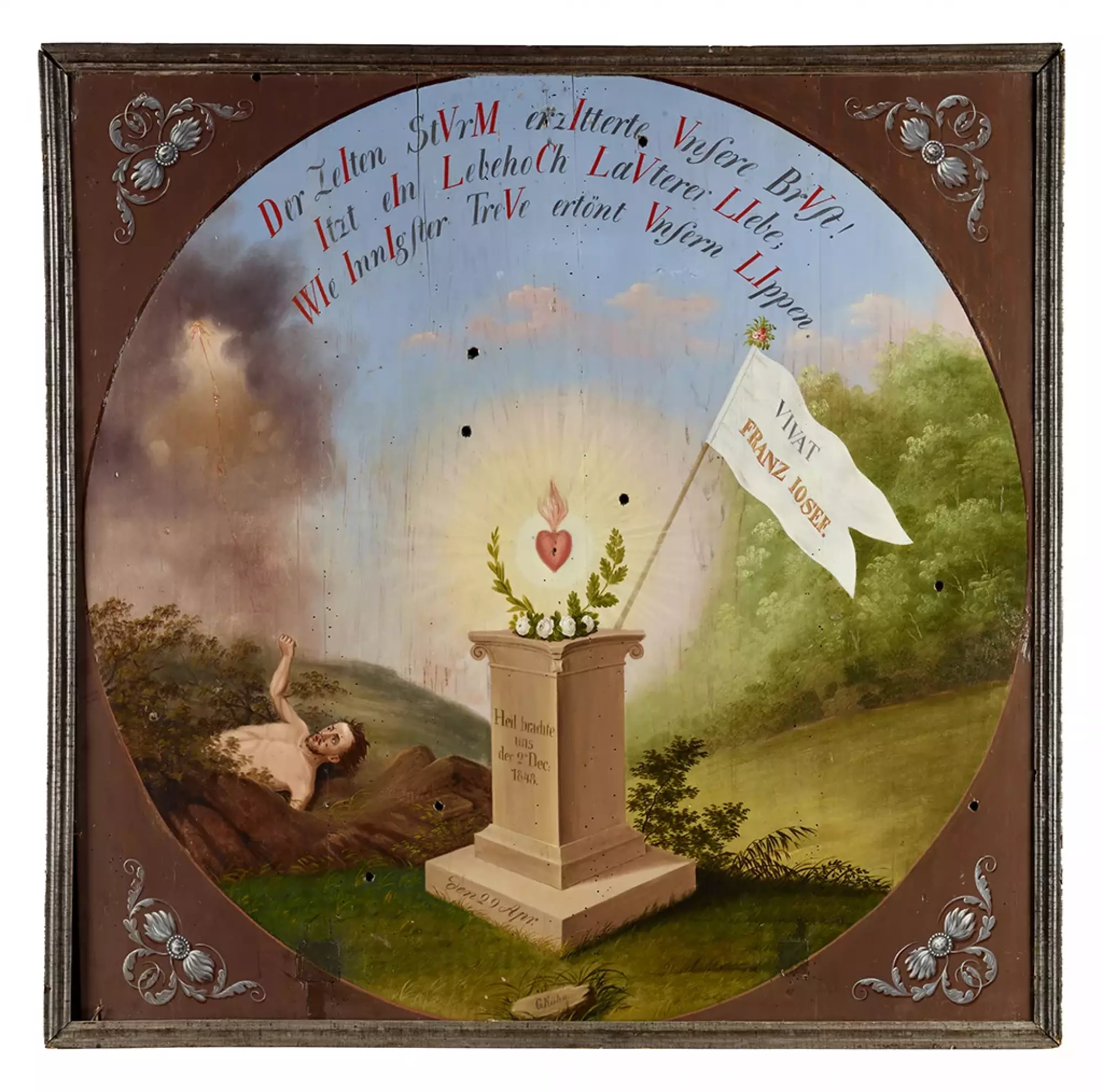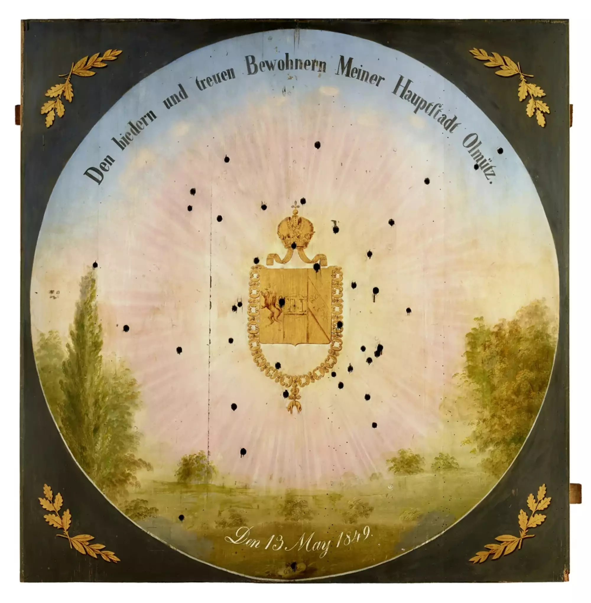 ![Střelecký terč na nástup císaře Františka Josefa I. 2. prosince 1848 v Olomouci. 1849. Olej na dřevě, 118,5 × 116 cm, signováno G. Kühn. Uprostřed terče se nachází planoucí srdce nad podstavcem s věncem růží, vavřínovou a dubovou ratolestí. Nápisy v českém překladu: na podstavci „Sláva nám přinesla 2. prosinec 1848“, na stupni podstavce „29. dubna“. Prapor za podstavcem nese nápis „VIVAT / FRANZ JOSEF.“. Vpravo od středu je namalována polozasutá postava muže se ztuhlou zaťatou pěstí. Při horním obvodu kruhového obrazu je umístěn text s chronogramem, v českém překladu: „Bouře doby rozechvěla naši hruď! Je to [zvolání] ,Ať žije!‘ hlasitější lásky, jak nejniternější věrností rozezněla naše rty.“ V rozích čtyřboké desky se opakuje motiv pazourku s plameny – dekor řetězu Řádu zlatého rouna. Vlastivědné muzeum v Olomouci, inv. č. O-2384. Foto Pavel Rozsíval.](https://www.olomouc.eu/administrace/action/repository_foto.php?x=370&y=278&orez=1&file=gallery/articles/23_/23258/08-02 terč císař OL002384.webp)