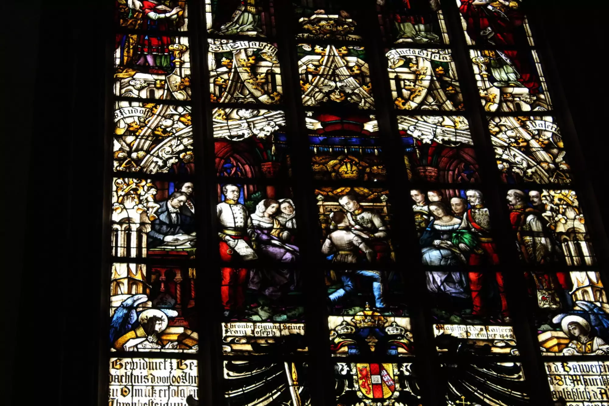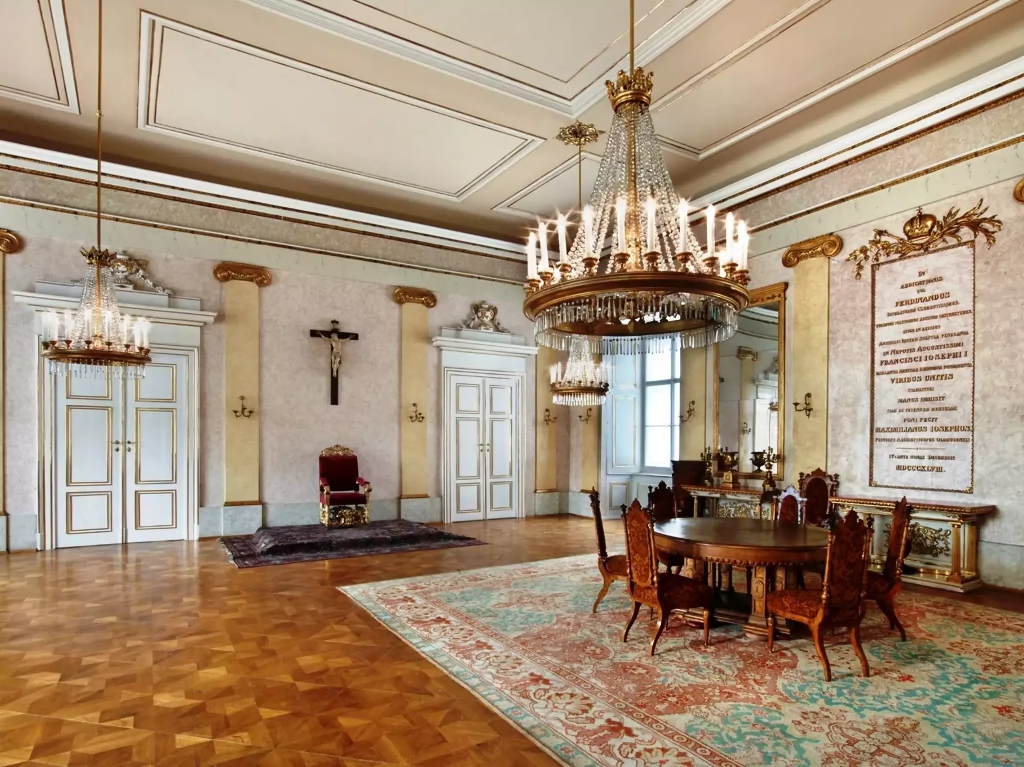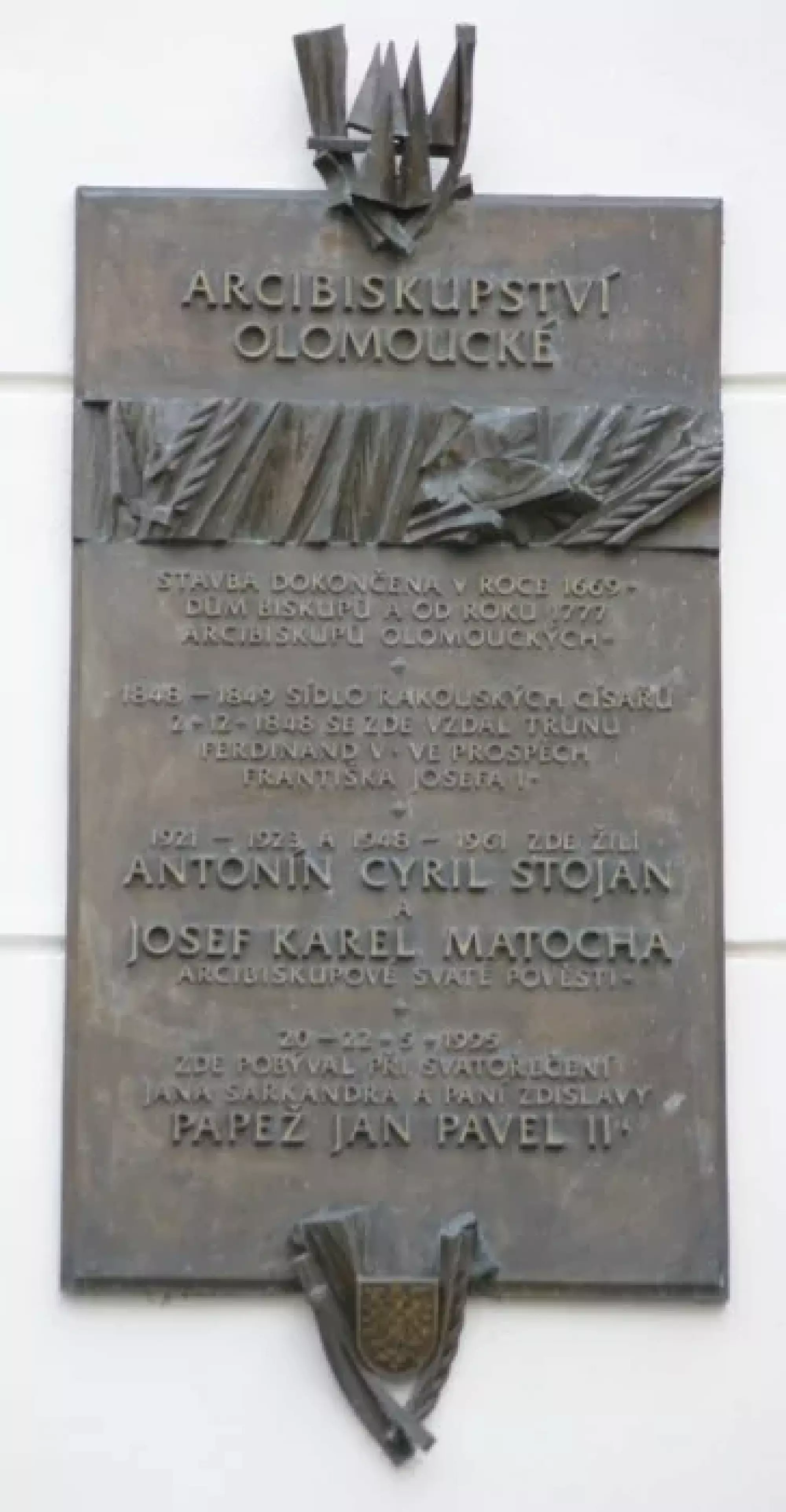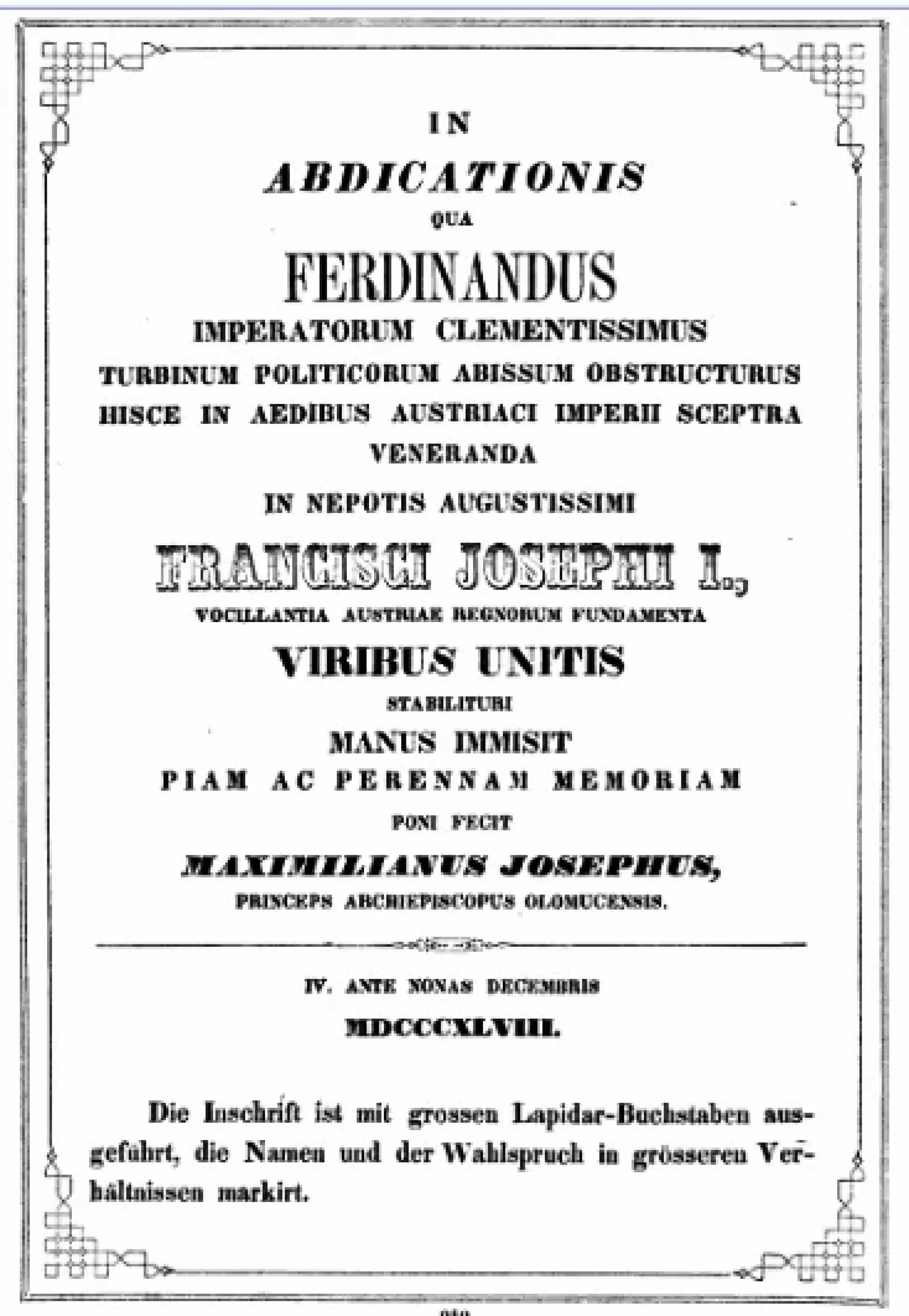 ![Latinský text na nápisové pamětní desce v Trůnním sále arcibiskupského paláce v Olomouci týkající se změny v obsazení rakouského císařského trůnu 2. prosince 1848. Český překlad: NA ZBOŽNOU A VĚČNOU PAMĚŤ ABDIKACE, JÍŽ FERDINAND, NEJLASKAVĚJŠÍ Z PANOVNÍKŮ, PŘINUCEN POLITICKÝMI TURBULENCEMI K ODCHODU, V TÉTO BUDOVĚ VLOŽIL ÚCTYHODNÉ ŽEZLO RAKOUSKÉHO CÍSAŘSTVÍ DO RUKOU SVÉHO NEJVZNEŠENĚJŠÍHO SYNOVCE FRANTIŠKA JOSEFA I., ABY UPEVNIL SPOJENÝMI SILAMI OTŘÁSAJÍCÍ SE ZÁKLADY RAKOUSKÉ VLÁDY, NECHAL ZŘÍDIT MAXMILIÁN JOSEF, KNÍŽE ARCIBISKUP OLOMOUCKÝ. IV. [DNE] PŘED PROSINCOVÝMI NONAMI MDCCCXLVIII [2. PROSINCE 1848]](https://www.olomouc.eu/administrace/action/repository_foto.php?x=370&y=278&orez=1&file=gallery/articles/23_/23258/08-09 Pamětní deska Trůnní sál.webp)
