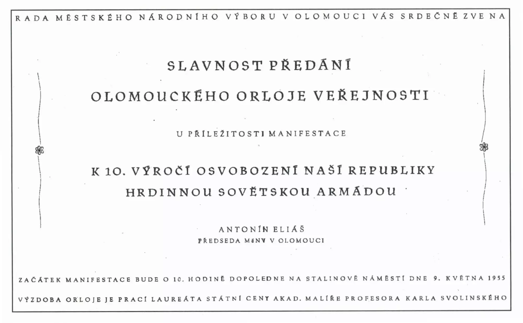 Nezbytnost poválečné renovace olomouckého orloje projednával Státní památkový úřad v Brně, jenž dopisem svého ředitele Stanislava Sochora z 16. září 1946 doporučil Ústřednímu národnímu výboru v Olomouci „nahradit malby na orloji dílem úplně novým, ale hodnotným a tvárným v duchu nové doby“. Vedení města proto vyhlásilo 2. dubna 1947 veřejnou soutěž, jíž se mohli zúčastnit všichni českoslovenští organizovaní výtvarní umělci; návrhy řešení orloje, dodané do uzávěrky soutěže 30. června 1947, jež by se umístily na prvních třech místech, byly dotovány odměnami 15 tisíc, 10 tisíc a pět tisíc Kčs. Třemi dodanými návrhy však byla soutěžní porota „nemile překvapena“, a proto doporučila 7. července 1947 Ústřednímu národnímu výboru v Olomouci, aby se obrátil na pražské výtvarníky moravského původu Richarda Wiesnera, Stanislava Ježka a Karla Svolinského, s výzvou, aby se ujali zhotovení nového olomouckého orloje. Jako první z nich kladně reagoval 15. července akademický malíř Karel Svolinský (1896–1986), rodák ze Svatého Kopečka a profesor Vysoké školy uměleckoprůmyslové v Praze. Dne 5. října 1947 Svolinský projednal v Olomouci s kulturním referentem ÚNV v Olomouci Stanislavem Křupkou svou koncepci obnovy orloje jakožto nového výtvarného díla, zachovávajícího nicméně původní strojní zařízení, jakož i rozvržení číselníků, a nahrazujícího dosavadní malby na omítce skleněnou mozaikou. V létě 1944, 1948 a 1950 podnikal Karel Svolinský se svou manželkou, akademickou sochařkou Marií Svolinskou roz. Veselou (1903–?), studijní cesty do Itálie, aby se zde obeznámili s technikou skleněné mozaiky, a v létě roku 1949 si Svolinský zajel na Hanou, neboť hodlal využít při výzdobě orloje folklorních motivů. Architektonickou a stavební úpravou orlojové niky byli pověřeni pražský architekt Antonín Drábek a olomoucký stavitel František Macharáček; proti novým pilířům protestoval bezvýsledně Státní památkový úřad pro Moravu a Slezsko v Brně 14. listopadu 1949. Dne 29. prosince 1950 byly z výklenku odstraněny pozůstatky dosavadního orloje, ale realizace nového orloje se vlekla. V roce 1953 byly v národním podniku Umělecké sklo – Česká mozaika Praha, Letohradská 3 (pobočce sklárny Nový Bor), vyrobeny čtyři miliony různobarevných skleněných dílků pro celkovou plochu 100 m2 mozaikové výzdoby orloje, s jejímž pokládáním bylo pod vedením Michala Ajvaze započato 12. května 1953. Hodinář Karel Schuster rozebral, vyčistil a opravil hodinový stroj a doplnil ho o letopočet, organista a organolog Antonín Schindler a hudební nástrojář Josef Harna rekonstruovali zvonkohru, píšťalovou hru a hlas kohouta, tehdejší ředitel Krajského vlastivědného muzea v Olomouci Jaroslav Kanyza navrhl nové kalendárium, koncipování číselníků s astronomickými údaji bylo úkolem ředitele Lidové hvězdárny v Olomouci předsedu pobočky České astronomické společnosti Vladimíra Petra. Jaroslav Kanyza rovněž prosadil, že zvonkohra bude hrát melodie tří hanáckých písní proti požadavku místních představitelů Komunistické strany Československa, aby z orloje zněly melodie Internacionály či Písně práce. Náklady na obnovení olomouckého orloje činily kromě honoráře K. Svolinského 954 447 Kčs, ze strany vedení města Olomouce odpovídali za provedené práce předseda Městského národního výboru v Olomouci Antonín Eliáš, jeho náměstek Antonín Lang a kulturní referenti Stanislav Křupka, Františka Kučerová a Ladislav Holásek. Původně měl být orloj odhalen již v květnu 1954, ale stalo se tak až 9. května 1955 v 10 hodin dopoledne během „manifestace k 10. výročí osvobození naší republiky hrdinnou Sovětskou armádou“, slavnostního projevu se ujal předseda MěNV v Olomouci Antonín Eliáš. Traduje se následující historická anekdota: Jedna dáma prý před aktem odhalení orloje zaujala místo v prostoru před orlojem, kam se posléze přesunuli z rozměrné tribuny postavené před radničním podloubím představitelé KSČ a „lidosprávy“, jakož i tvůrci orloje, a ocitla se vedle mužíka s baretem na hlavě. Když byla stržena plachta zakrývající orloj, vykřikla dáma zděšeně: „Prokristapána, který idiot tohle udělal?“ A ten mužík se na ni bolestně podíval a pravil: „Já, milostivá paní.“