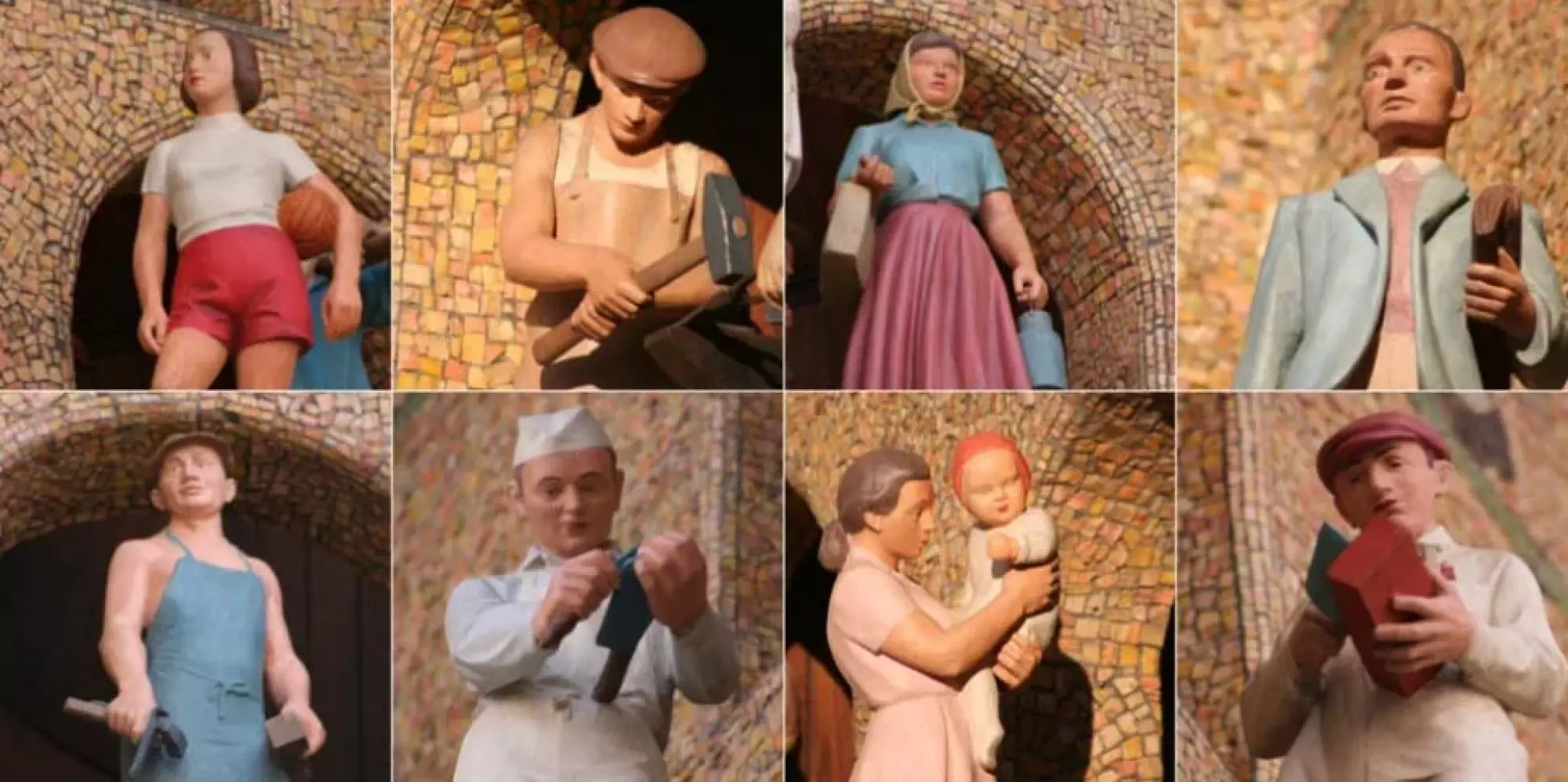 Figury oživující olomoucký orloj, vysoké 70–75 cm, navrhla a vymodelovala sochařka Marie Svolinská, na sádrových modelech pracovali také její studenti na Vysoké škole uměleckoprůmyslové v Praze, kteří pro některé postavy posloužili i jako živé předlohy (sochař Olbram Zoubek – Diskař, sochařka a Zoubkova manželka Eva Kmentová – Házenkářka, podle sdělení Olbrama Zoubka však Kmentová stála modelem pro Matku s dítětem v náručí). Figury nato vyřezal do lipového dřeva olomoucký řezbář Bohumil Zemánek a údajně je polychromoval Karel Svolinský. Horní patro se dvěma otvory je osazeno statickými, stále viditelnými figurami. Vlevo kladivy odbíjejí kovář a jeho pomocník v souzvuku čtvrti hodin, celé hodiny odbíjí jen pomocník. V pravém otvoru stojí u notového stojanu klarinetista a trumpetista, jejichž ruce se původně během více než půlhodinové polední produkce zvedaly s nástroji k ústům těchto hudebníků za zvuků píšťal hrajících pastorálu zkomponovanou Vladimírem Lablerem, varhaníkem v olomouckém kostele sv. Mořice, sbormistrem a ředitelem hudební školy (1847–1914) – nyní i po restaurování všech figur orloje v letech 2019–2011 nejsou ruce hudebníků mobilní. Nato se dvanáct figur ve spodním patře se při zvucích tří lidových hanáckých písní zvonkohry otáčí na dvou točnách se šesti paprsky umístěných ve dvou otvorech. Jsou to vlevo Tkadlena s cívkami příze v náručí, Řezník brousící si sekáček, Úředník s kloboukem v pravici a se složenou aktovkou v levici, Matka s dítětem v náručí, Bednář v zástěře s teslicí (bednářskou sekerou) a hoblíkem v rukou a Sportovec – Diskař s diskem v rukou, vpravo Hospodyně s konvičkou na mléko a nákupní taškou, Kopáč s krumpáčem a lopatou na rameni, Zedník kladoucí lžící maltu na cihlu, Kovář v kožené zástěře s kladivem a kleštěmi, Zahradník opírající se o rýčem a otírající si předloktím pot z čela a Sportovkyně – Házenkářka (též Volejbalistka) s míčem drženým v podpaždí. Při zvonkohře počínající melodií písně Za Náměšťó na kopečko zpočátku roztáčejí obě točny s figurami proti sobě, poté se točí levá točna, za zvuků melodie písně Daleká, šeroká je cesta po Holomóc se točí pravá točna, a když zní melodie písně Vrbe se nám zelenajó, opět se otáčejí obě točny proti sobě. Celou produkci ukončuje trojí zakokrhání kohouta, jenž třikrát pozvedne křídla – tato figura, upevněná na kovové mřížce ve středu mezi otvory s postavami, byla zhotovena z pozlaceného plechu ve zlatnické dílně Waltera Linka. Dřevěné polychromované figury, opravované v dubnu 1966, byly v září 2009 až březnu 2010 restaurovány v ateliéru akademického malíře a restaurátora Jiřího Látala v Litomyšli; vzhledem k chybnému technologickému postupu bylo nutno v červnu 2010 výsledek práce restaurátora reklamovat, takže oprava figurální části orloje byla dokončena až v dubnu 2011.