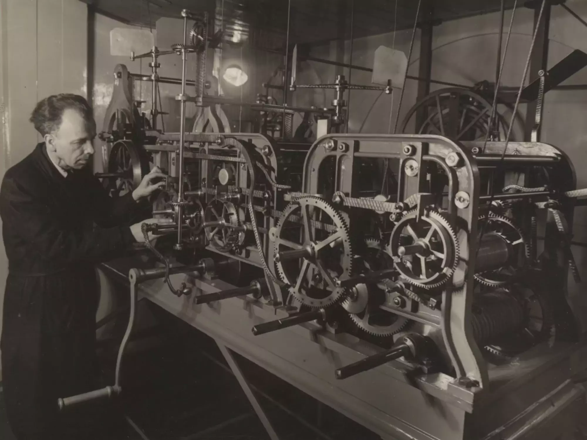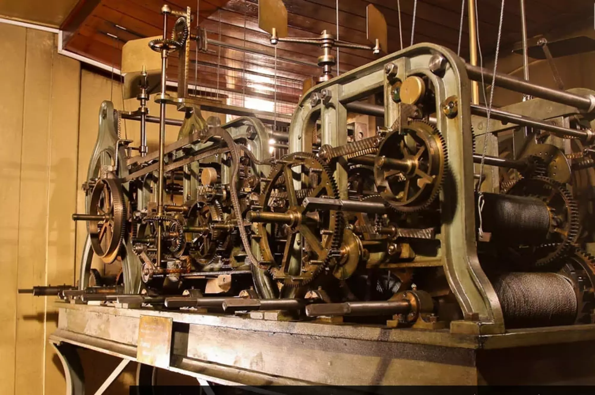 Hodinový stroj orloje, zhotovený firmou Ed. Korfhage & Söhne z Bueru (nyní městská část města Melle poblíž Osnabrücku v Dolním Sasku) pro orloj renovovaný v letech 1894–1898, zůstal zachován i pro orloj novodobý. Hodinář Konrad Schuster stroj, nacházející v prvním patře radniční budovy bezprostředně za stěnou niky orloje, opravil a doplnil jej o výše již zmíněný letopočet. Součástí mechanismu o odhadované hmotnosti 2 800 kg je osm závaží o hmotnosti 25 až 70 kg, jež je třeba denně ručně natahovat. Chod jicího stroje reguluje kyvadlo, jehož čočka, upevněná na jasanové tyči, má hmotnost 25 kg. Denisonův gravitační krok, jenž zajišťuje konstantní velikost vnější síly uvádějící kyvadlo do pohybu, zaručuje přesný chod jicího stroje a je opatřen zařízením odbíjející hodinové čtvrti a celé hodiny, jakož i mechanismy pohánějícími figury orloje, hlas a křídla kohouta a čtyři doplňkové číselníky. O údržbu mechanismu orloje pečuje nyní vnuk Konrada Schustera Karel Schuster.