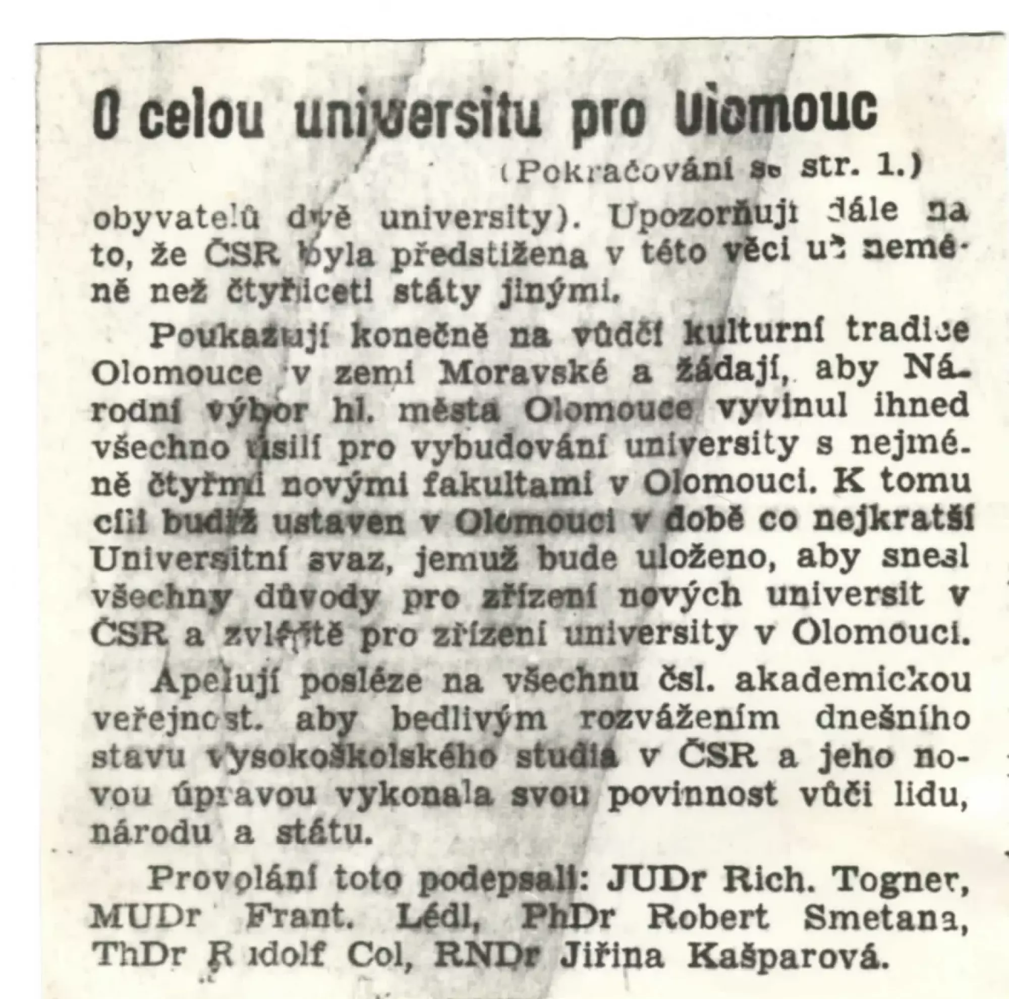 20. července 1945 Akční výbor vysokoškolského studentstva informoval předsedu vlády ČSR Zdeňka Fierlingera při jeho návštěvě v Olomouci o úsilí vybudovat ve městě univerzitu. Na počátku srpna jednal Zdeněk Šprinc ve Střelicích s Kunešem Sonntagem, jenž jako nacisty vězněný člen vedení předválečného Ústředního svazu československého studentstva připravoval s podporou vlády Světový sjezd studentstva v Praze (World Students Congress in Prague), jenž se měl uskutečnit ve dnech 17. až 23. listopadu 1945. Šprinc navrhl Sonntagovi, aby součástí programu sjezdu bylo prohlášení vlády o obnově olomoucké univerzity, a Kuneš Sonntag nato naplánoval zájezd delegátů kongresu do Olomouce a ke hrobu Jana Opletala v Nákle. (Student Lékařské fakulty Karlovy Univerzity Jan Opletal byl smrtelně zraněn během protinacistické demonstrace 28. října 1939 a 17. listopadu zemřel. Londýnská schůze Mezinárodní studentské rady v roce 1941 přijala Prohlášení spojeneckých studentů k 17. listopadu, jež vyhlásilo tento den Mezinárodním dnem studentstva; od roku 2000 je 17. listopad v České republice státním svátkem pod názvem Den boje za svobodu a demokracii.) PhDr. Robert Smetana zformuloval memorandum československé vládě, jež zdůvodňovalo zřízení celé univerzity a jež bylo 15. srpna 1945, v den oslavy hanáckých dožínek, jichž se zúčastnili také vládní činitelé, otištěno pod titulkem Za celou univerzitu pro Olomouc ve všech olomouckých novinách. Koncem srpna byla do Slovanského domu svolána veřejná schůze, na níž se ustavila delegace, jež měla v Praze jednat s představiteli československé vlády o obnovení olomoucké univerzity; delegaci měli tvořit Zdeněk Šprinc, Vladimír Mohapl, děkan CMFB prof. ThDr. František Cinek a po jednom olomouckém poslanci Ústavodárného národního shromáždění z každé ze čtyř tehdejších politických stran (Komunistické strany Československa, Československé strany národně socialistické, Československé strany lidové a Československou sociální demokracii), do Prahy však 4. září 1945 odcestoval z těchto čtyř zástupců pouze krajský tajemník KSČ a poslanec Jura Sosnar-Honzák (občanským jménem Jiří Sosnar); k delegaci se připojila i Šprincova snoubenka Stanislava Kavanová. Kuneš Sonntag vyjednal s ministrem dopravy divizním generálem Antonínem Hasalem, že delegace bude moci cestovat do Prahy motorovým rychlíkem Slovenská strela. V sídle parlamentu (dnešního Rudolfina) očekával delegaci předseda vlády a Československé sociální demokracie Zdeněk Fierlinger, olomoucký rodák, jenž usoudil, že bude vhodné vyčkat příchodu primátora hlavního města Prahy a předsedy Čs. strany národně socialistické Petra Zenkla, a odeslal delegaci do sněmovní kantýny. Zde seděl podroušen alkoholem místopředseda československé vlády, předseda Národní fronty a předseda KSČ Klement Gottwald, jenž nabídl delegaci slivovici a požádal ji o zpěv moravských lidových písní. Nato si Stanislava Kavanová přála vidět Antonína Zápotockého, poslance KSČ a předsedu Ústřední rady odborů. Se Zápotockým se delegace setkala na chodbě; Zápotocký poznal Sonntaga, s nímž byl tři roky vězněn v koncentračním táboře Sachsenhausenu, a rozvinul se podle Sonntaga tento dialog: „Co ty tady děláš?“ – „Chceme univerzitu v Olomouci.“ – „Kdybyste se na to teď vysrali, my potřebujeme obilí a uhlí, a ne nějaké inteligenty!“1