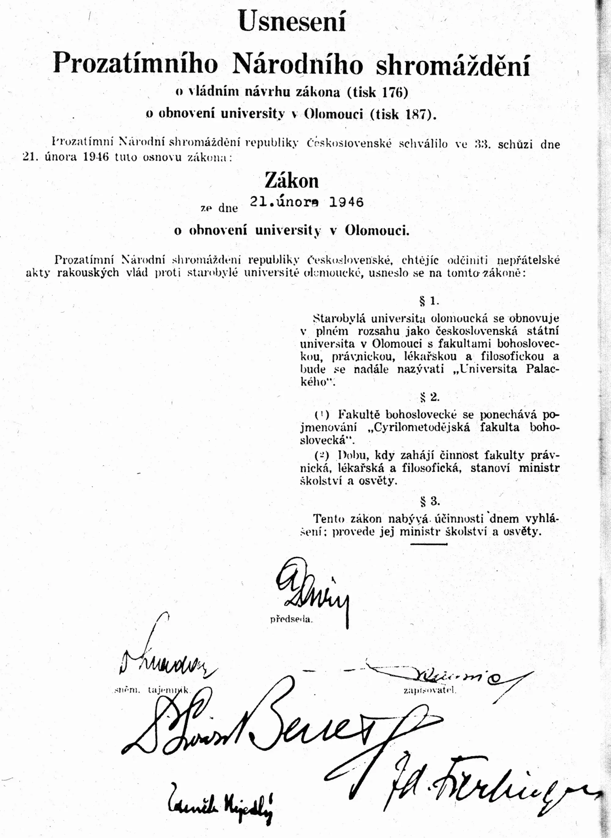 Zákon ze dne 21. února 1946 o obnovení univerzity v Olomouci.