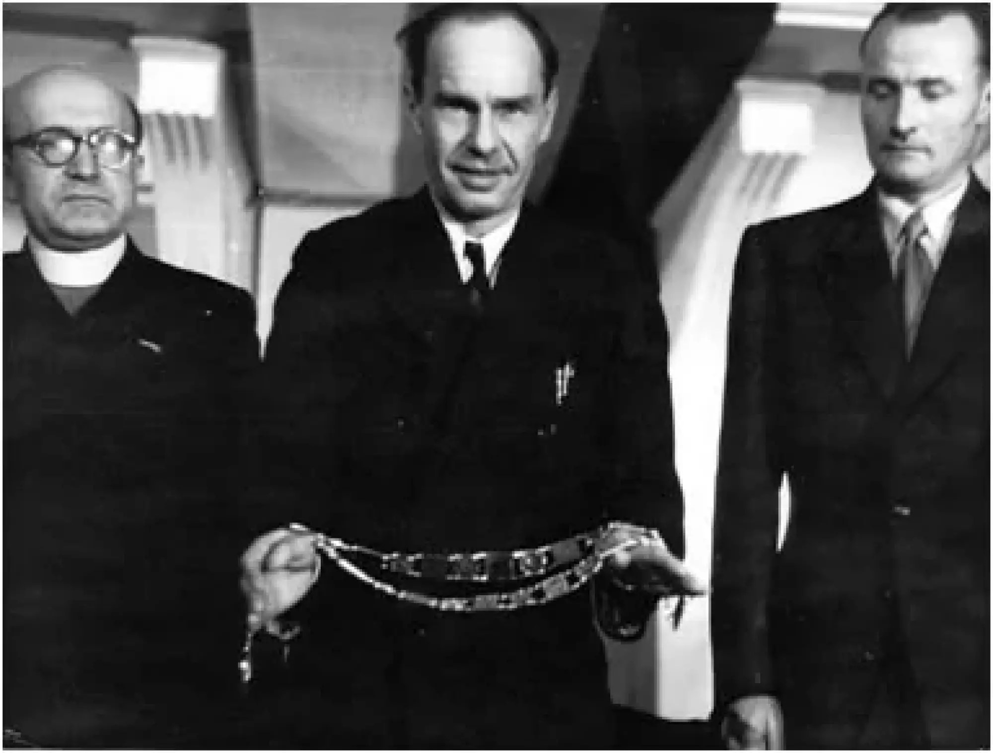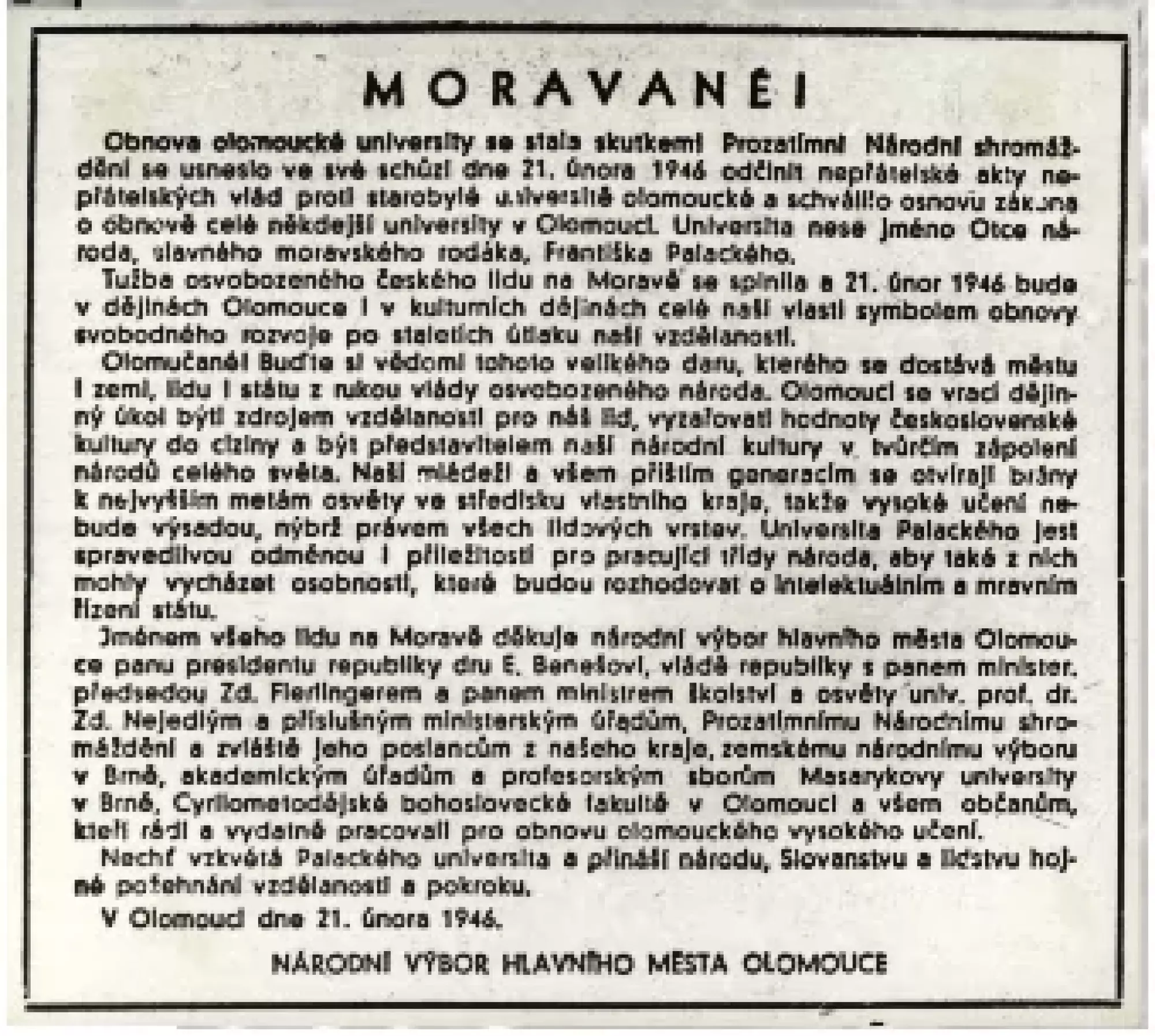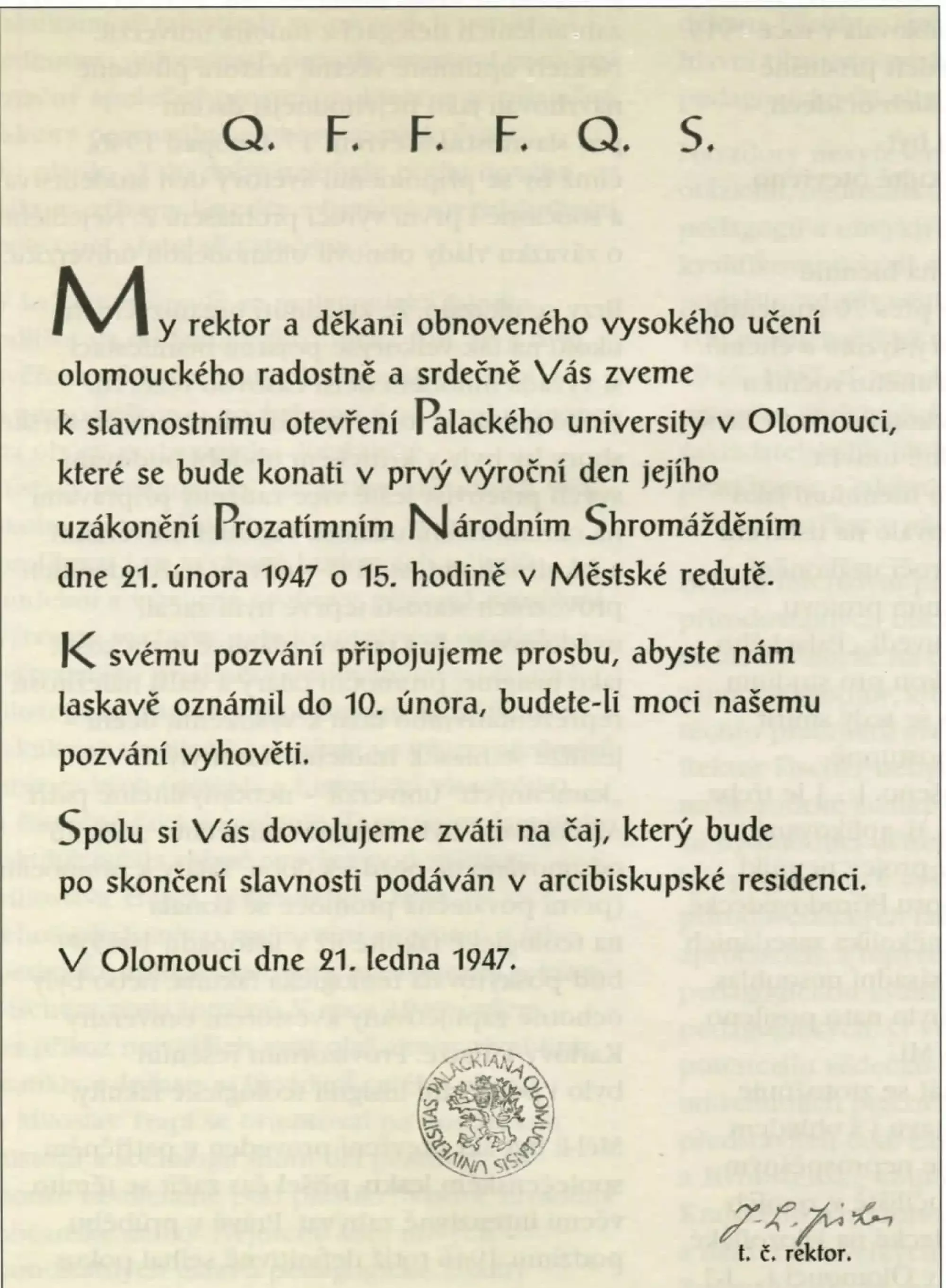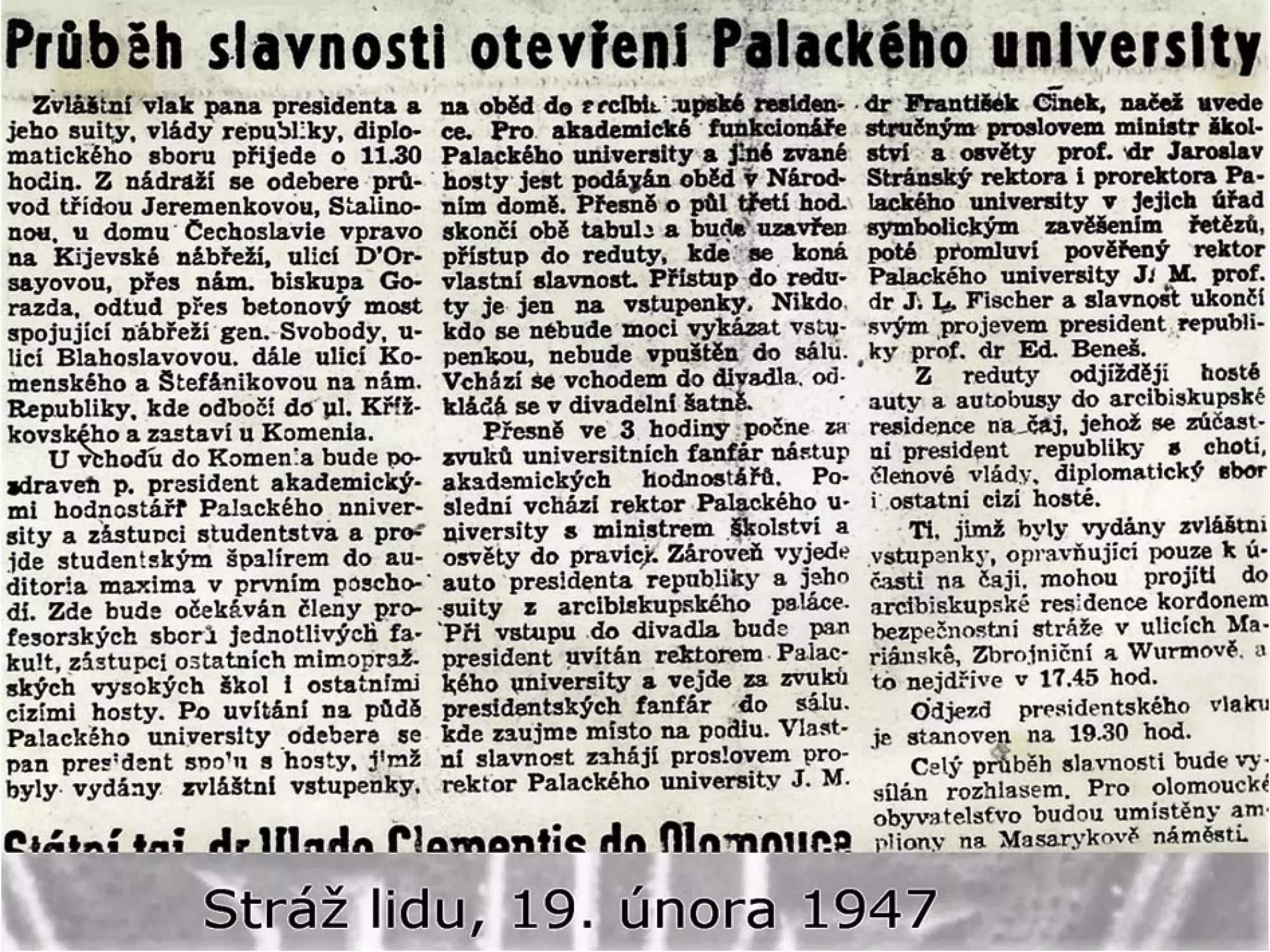 „Vlastní slavnostní akt se konal v sále olomoucké Reduty. Slavnostnímu shromáždění dominovali prezident Československé republiky Edvard Beneš s chotí Hanou a předseda vlády ČSR Klement Gottwald s chotí Martou; přítomni byli i dva premiérovi náměstci, Zdeněk Fierlinger a Petr Zenkl. Ke společenskému lesku zajisté přispěla také přítomnost šesti československých ministrů, patnácti poslanců Ústavodárného národního shromáždění, jednoho primátora, dvanácti rektorů, dvaadvaceti děkanů, pěti velvyslanců (Belgie, Norska, Polska, Švédska, SSSR, Francie, Jugoslávie, Číny) a třinácti vyslanců (Belgie, Norska, Polska, Švédska, Švýcarska, Holandska, Dánska, Bulharska, Mexika, Itálie, Iránu, Argentiny a Řecka). Hlavní projev pronesl prezident republiky, následně promluvil rektor UP J. L. Fischer, jehož dekoroval rektorským řetězem tehdejší ministr školství a osvěty Jaroslav Stránský. Slavnostní raut proběhl v arcibiskupské rezidenci. Uspořádat tabuli pro více než 250 prominentních účastníků vskutku nebylo v době přídělového systému jednoduché. Ministerstvo výživy sice uvolnilo pro potřeby UP mimořádný příděl masa, másla, cukru, vajec a umělého tuku, ale hlavní tíha v zajištění potřebných poživatin spočinula na bedrech jednotlivých příznivců olomoucké univerzity. A tak ,sponzoři‘ svezli do arcibiskupského paláce krocany, vajíčka, kávu, čaj, ovocné šťávy i desítky kilogramů prvotřídní svíčkové a telecího masa. Aby housky i rohlíky náležitě křupaly, musela firma Otto Siegl prostřednictví UP požádat Okresní úřad ochrany práce, aby jí udělil povolení pracovat v noci z 20. na 21. února. Také nápoje získala Univerzita Palackého darem – čepoval se Prazdroj a ve štíhlých číších jiskřilo jihomoravské bílé i červené víno, které ochotně dodalo ovocnicko-vinařské družstvo Vinopa z Velkých Pavlovic. Mimochodem – předseda tohoto družstva a poslanec tehdejšího parlamentu František Štambacher seděl v Redutě vedle Václava Havla, otce našeho prvního polistopadového prezidenta.“1