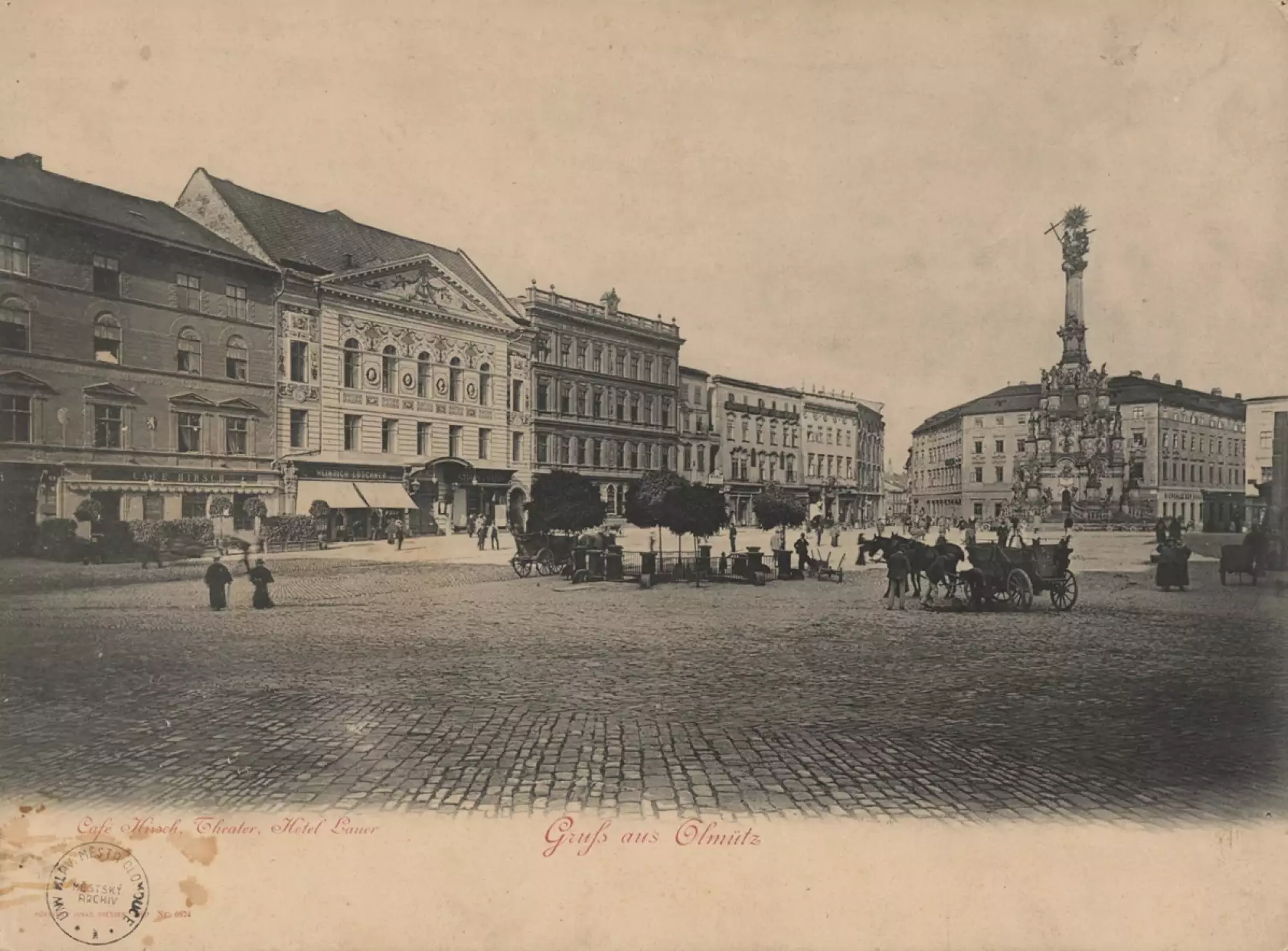Velkoformátová pohlednice („Riesenkarte“) z roku 1899 na papírové podložce vložená do novodobé papírové pasparty, pod vlastní fotografií německý popis červeným písmem (Café Hirsch, Theater, Hotel Lauer, Gruß aus Olmütz), v levém dolním rohu jméno vydavatele (Jonas Römmler Dresden, Nr. 6824), v levém dolním rohu černý otisk kulatého razítka s nápisem „UNV Hlav. města Olomouce, městský archiv“, na rubu vytištěn německý nápis zeleným písmem „Riesenkarte, Drucksache“ s prostorem pro adresu, uprostřed tužkou psaný záznam „Od Prombergera 1/9 1925, s číslem 2206“, dále na rubu fialový otisk kulatého razítka s nápisem „Archiv hlav. města Olomouce“. Státní okresní archiv Olomouc, fond Sbírka obrazového materiálu a fotografií Olomouc, značka fondu M 8-34, inv. č. 2, signatura I/5.