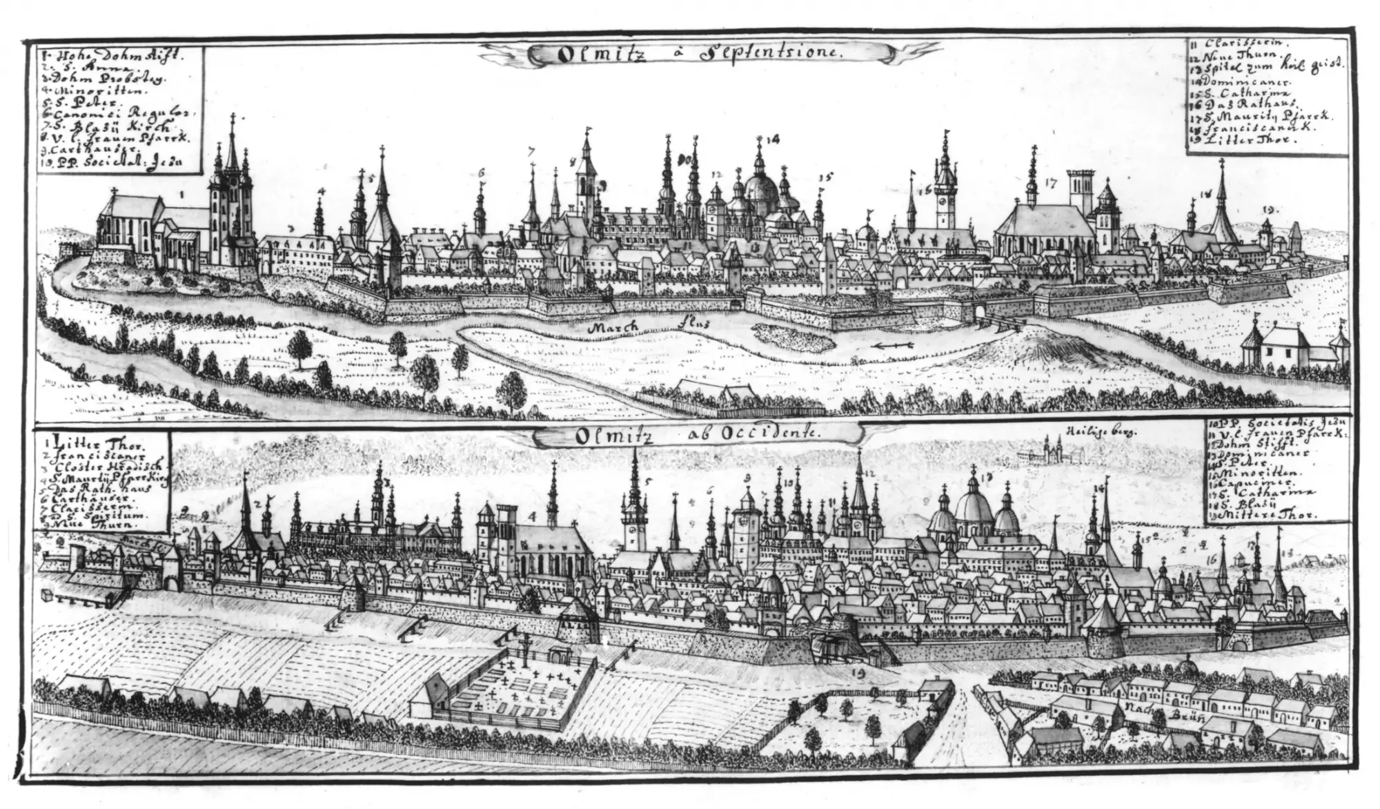 Překlad německé legendy – Olomouc ze severu: 1 – vysoký dómský klášter, 2 – Svatá Anna, 3 – dómské probošství (spr. kapitulní děkanství), 4 – minorité, 5 – Svatý Petr, 6 – regulovaní kanovníci (tj. augustiniáni), 7 – kostel sv. Blažeje, 8 – farní kostel Naší milé Paní, 9 – kartuziáni, 10 – otcové Tovaryšstva Ježíšova, 11 – klarisky, 12 – Nová věž, 13 – špitál U Svatého Ducha, 14 – dominikáni, 15 – Svatá Kateřina, 16 – radnice, 17 – farní kostel sv. Mořice, 18 – františkánský kostel, 19 – Litovelská brána; řeka Morava. – Olomouc od západu: 1 – Litovelská brána, 2 – františkáni, 3 – klášter Hradisko, 4 – farní kostel sv. Mořice, 5 – radnice, 6 – kartuziáni, 7 – klarisky, 8 – U Sv. ducha, 9 – Nová věž, 10 – otcové Tovaryšstva Ježíšova, 11 – farní kostel Naší milé Paní, 12 – dómský klášter, 13 – dominikáni, 14 – Svatý Petr, 15 – minorité, 16 – kapucíni, 17 – Svatá Kateřina, 18 – Svatý Blažej, 19 – Střední brána.