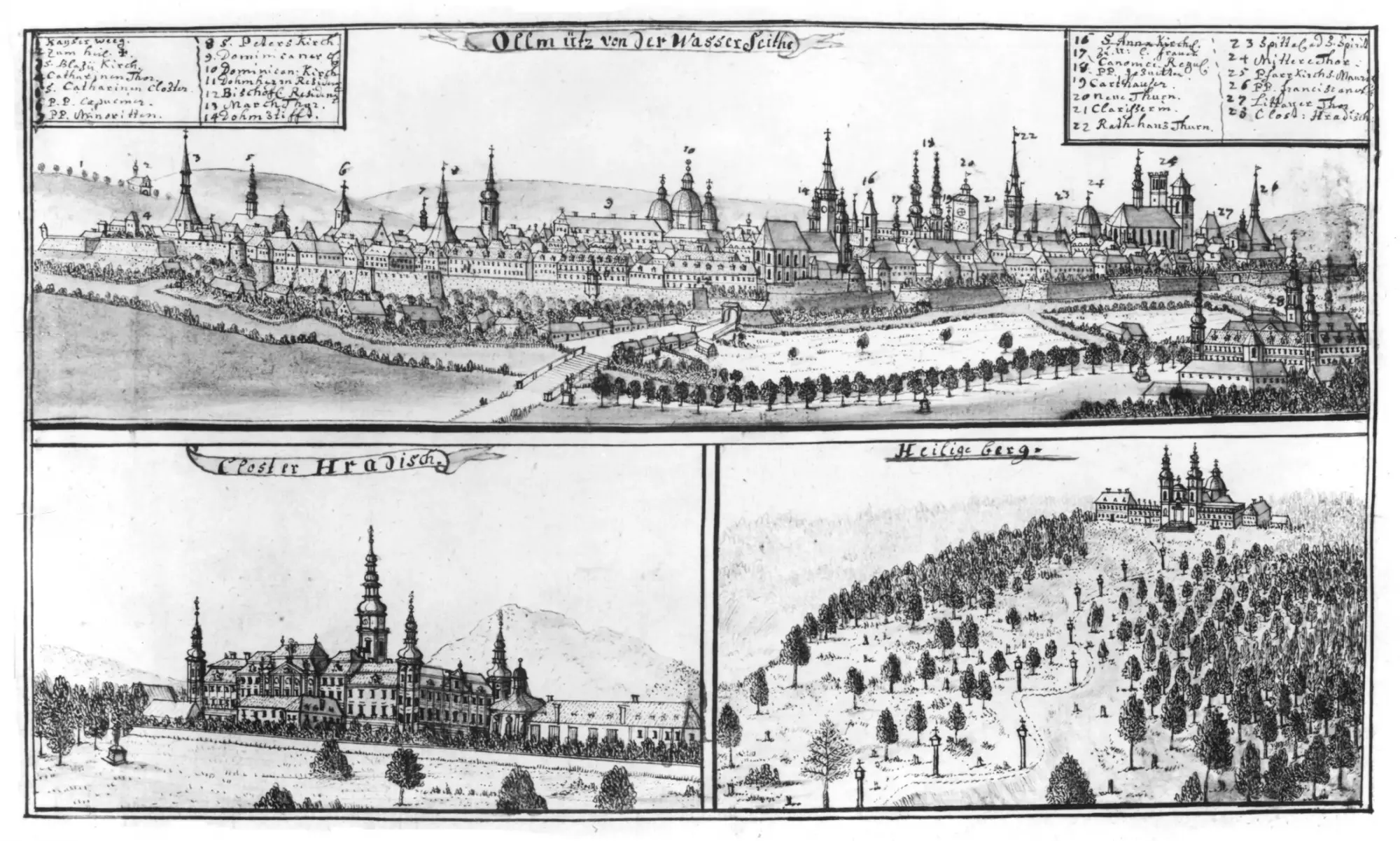 Překlad německé legendy: 1 – císařská silnice, 2 – U Svatého Kříže, 3 – kostel sv. Blažeje, 4 – Kateřinská brána, 5 – klášter sv. Kateřiny, 6 – otcové kapucíni, 7 – otcové minorité, 8 – kostel sv. Petra, 9 – dominikánský klášter, 10 – dominikánský kostel, 11 – kanovnická rezidence, 12 – biskupská rezidence, 13 – Moravská (spr. Hradská) brána, 14 – dómský klášter, 15 – (vynecháno) 16 – kostel sv. Anny, 17 – U Naší milé Paní, 18 – regulovaní kanovníci (tj. augustiniáni), 19 – kartuziáni, 20 – Nová věž, 21 – klarisky, 22 – radniční věž, 23 – špitál U Svatého Ducha, 24 – Střední brána, 25 – farní kostel sv. Mořice, 26 – otcové františkáni, 27 – Litovelská brána, 28 – klášter Hradisko.