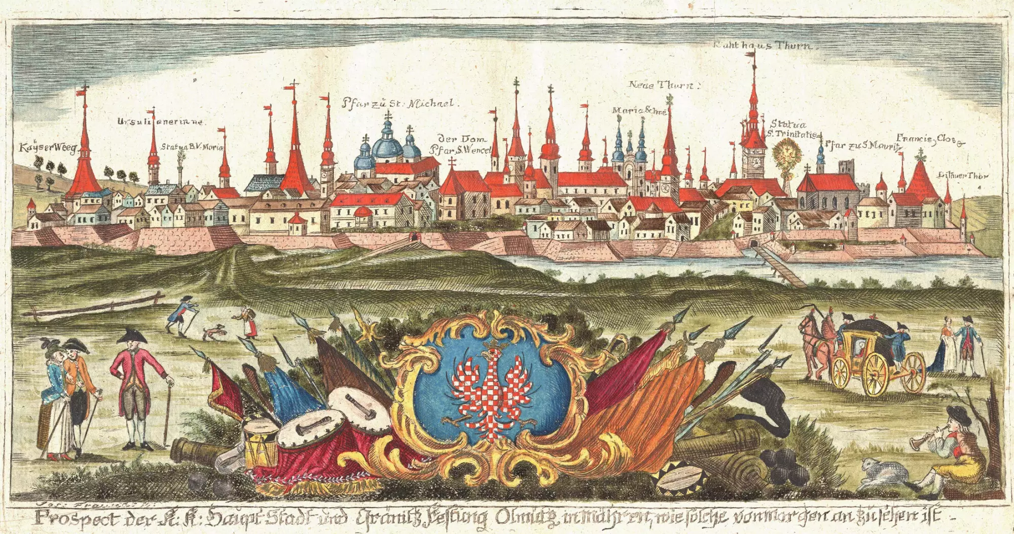 Pohled na císařsko-královské hlavní město Olomouc, jak je lze spatřit od východu. Po roce 1758. Kolorovaná rytina, ryl Josef Freund(t). 25,5 × 13,5 cm. Filip Jakub Friebeck: Tags Buch der Belagerung von Olmütz.