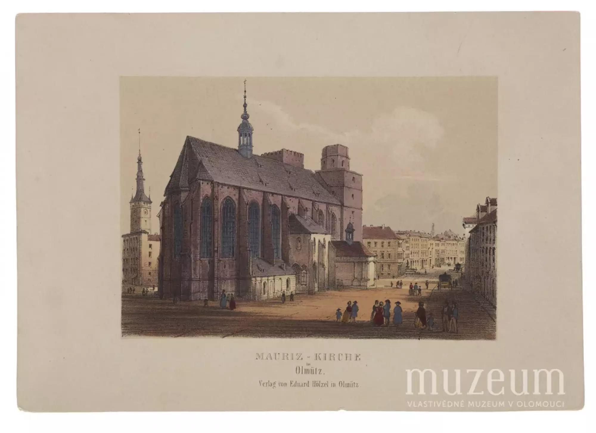 Album von Olmütz. – Mauriz-Kirche in Olmütz. (Kostel sv. Mořice v Olomouci.) Po 14. 10. 1848 – před 5. 5. 1849, kolorovaná litografie, kreslil Felix Philipp Kanitz (1829–1904), litografoval Franz Xaver Josef Sandmann (1805–1856), vytiskl Johann Rauh (1803–1863, Vídeň), vydal Eduard Hölzel (1817–1885).