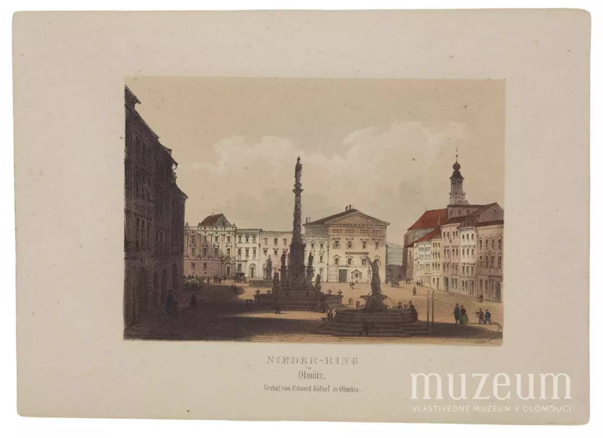 Album von Olmütz. Nieder-Ring in Olmütz. (Dolní náměstí v Olomouci.)Po 14. 10. 1848 – před 5. 5. 1849, kolorovaná litografie, kreslil Felix Philipp Kanitz (1829–1904), litografoval Franz Xaver Josef Sandmann (1805–1856), vytiskl Johann Rauh (1803–1863, Vídeň, vydal Eduard Hölzel (1817–1885). Olomouc.