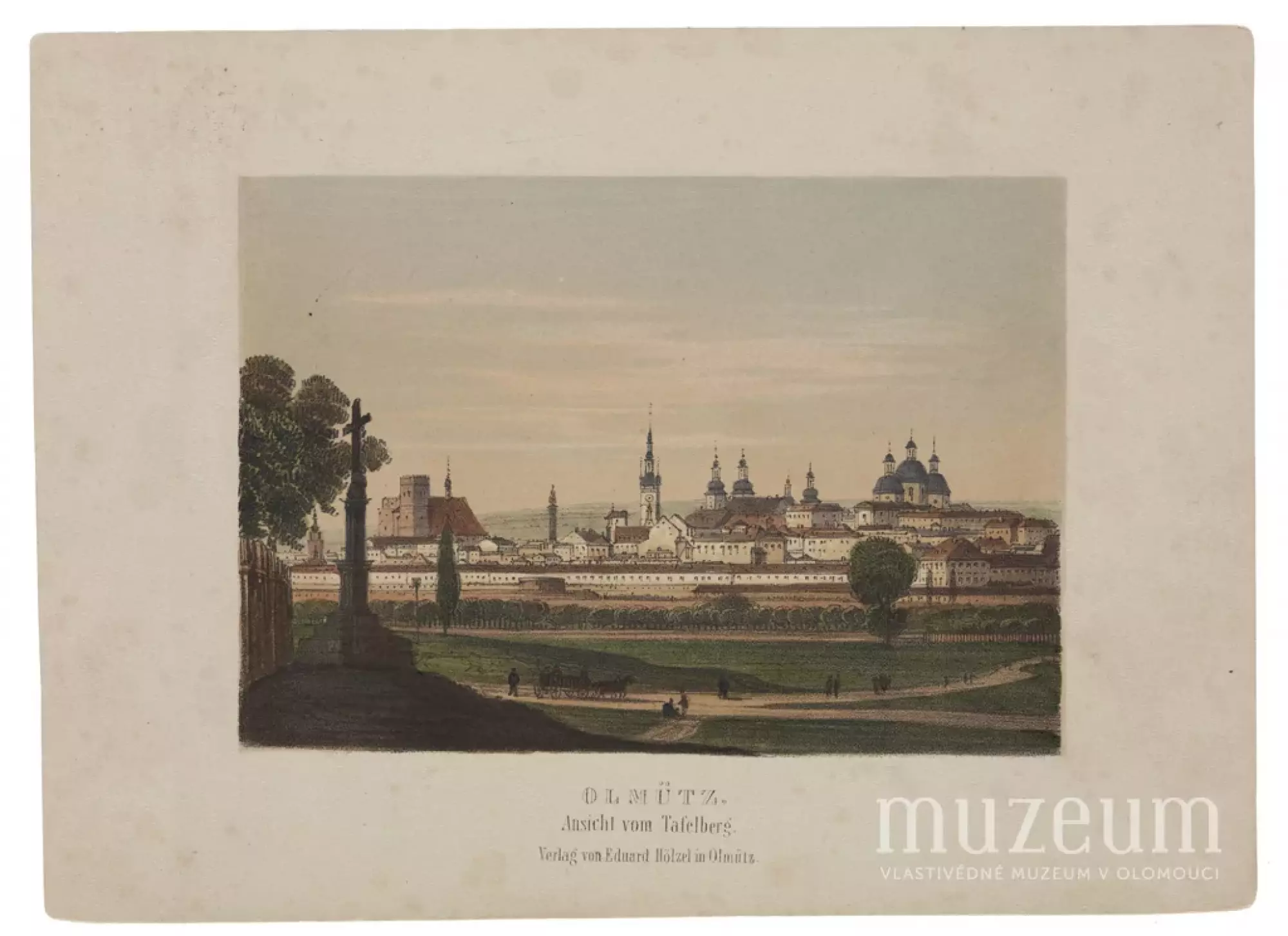 Album von Olmütz. – Olmütz. Ansicht von Tafelberg. (Olomouc. Pohled z Tabulového vrchu.) Po 14. 10. 1848 – před 5. 5. 1849, kolorovaná litografie, kreslil Felix Philipp Kanitz (1829–1904), litografoval Franz Xaver Josef Sandmann (1805–1856), vytiskl Johann Rauh (1803–1863), Vídeň, vydal Eduard Hölzel (1817–1885), Olomouc.