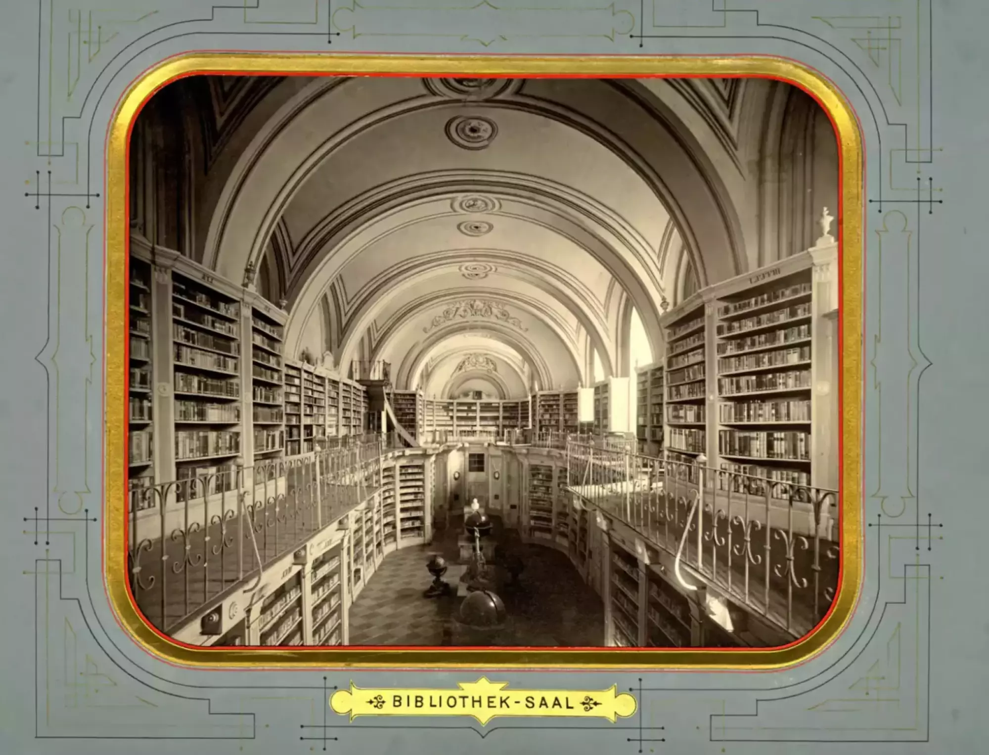 Sál Studijní knihovny v lodi zrušeného klášterního kostela sv. Kláry (nyní výstavní sál sv. Kláry Vlastivědného muzea v Olomouci, nám. Republiky 5), fotografie, kolem roku 1900, Státní okresní archiv v Olomouci, fond M 8-34, Sbírka obrazového materiálu a fotografií Olomouc, sign. XIII 22, inv. č. 1327
