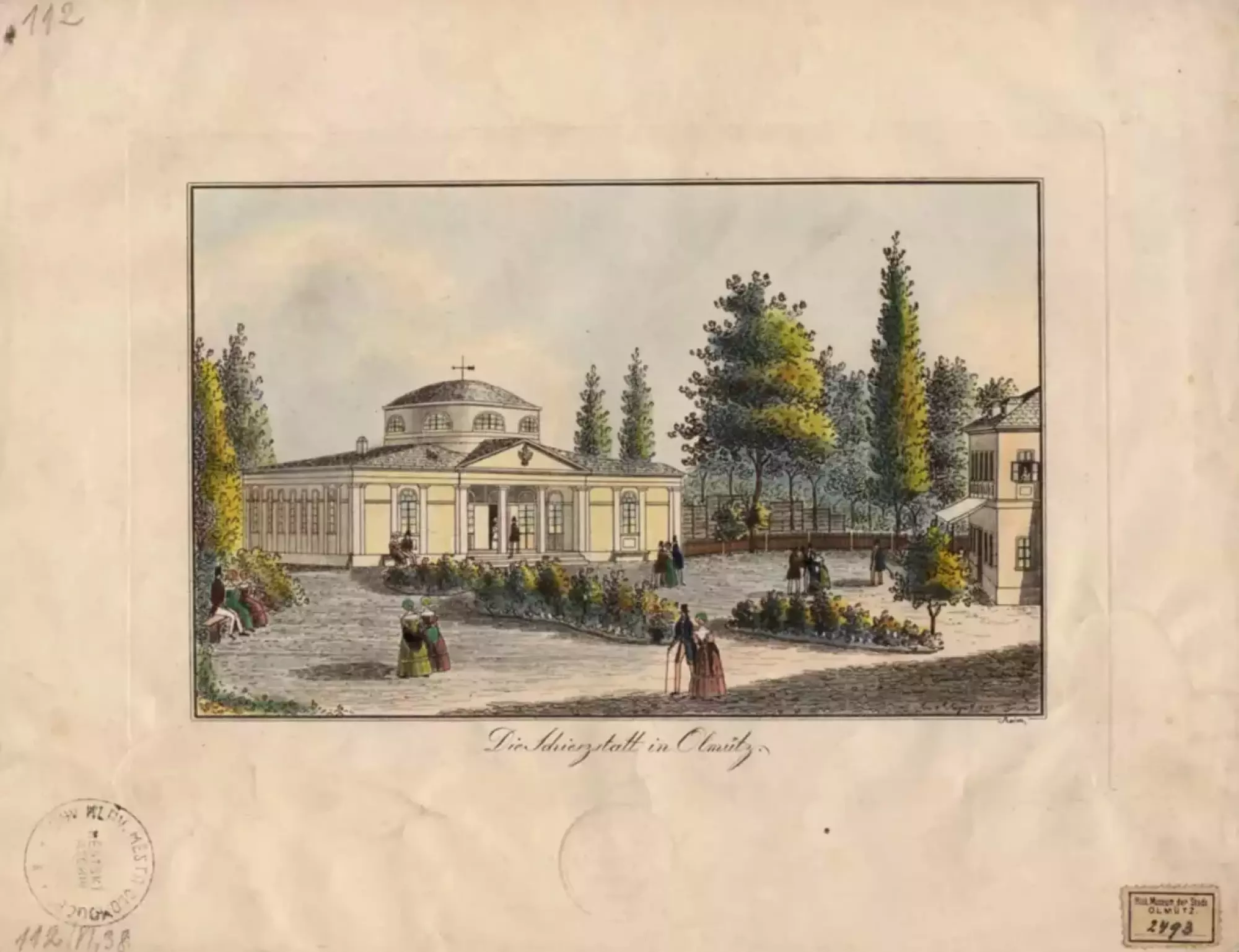 Johann Vinzenz Reim (1796–1858): Měšťanská střelnice v Olomouci. Kolorovaný lept datovaný 4. srpna 1842. Státní okresní archiv v Olomouci, Archiv města Olomouce, fond M-34 Sbírka obrazového materiálu a fotografií Olomouc, sign. VI/38, inv. č. 454
