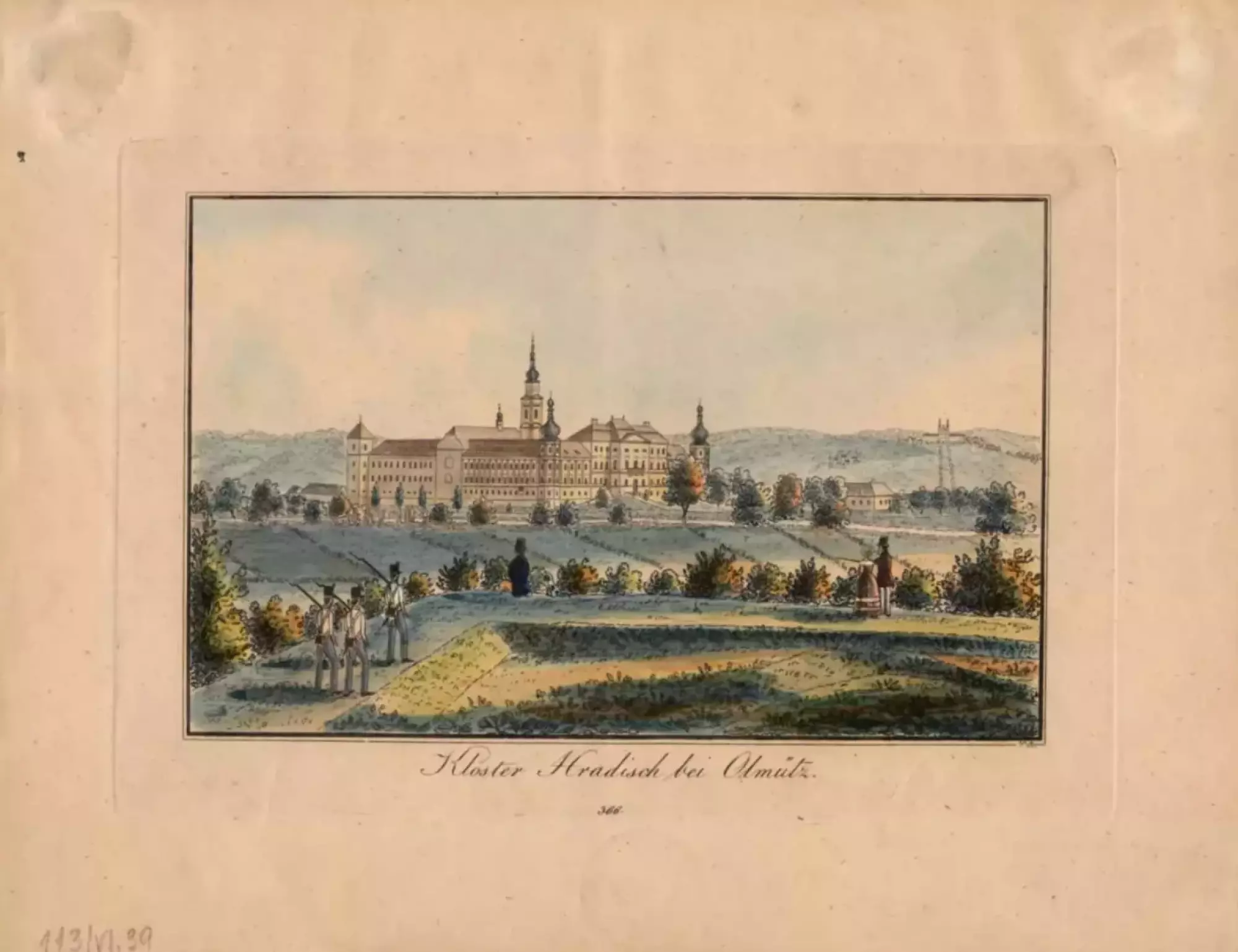 Johann Vinzenz Reim (1796–1858): Klášter Hradisko u Olomouce. Kolorovaný lept. Státní okresní archiv v Olomouci, Archiv města Olomouce, fond M-34 Sbírka obrazového materiálu a fotografií Olomouc, sign. VI/39, inv. č. 455