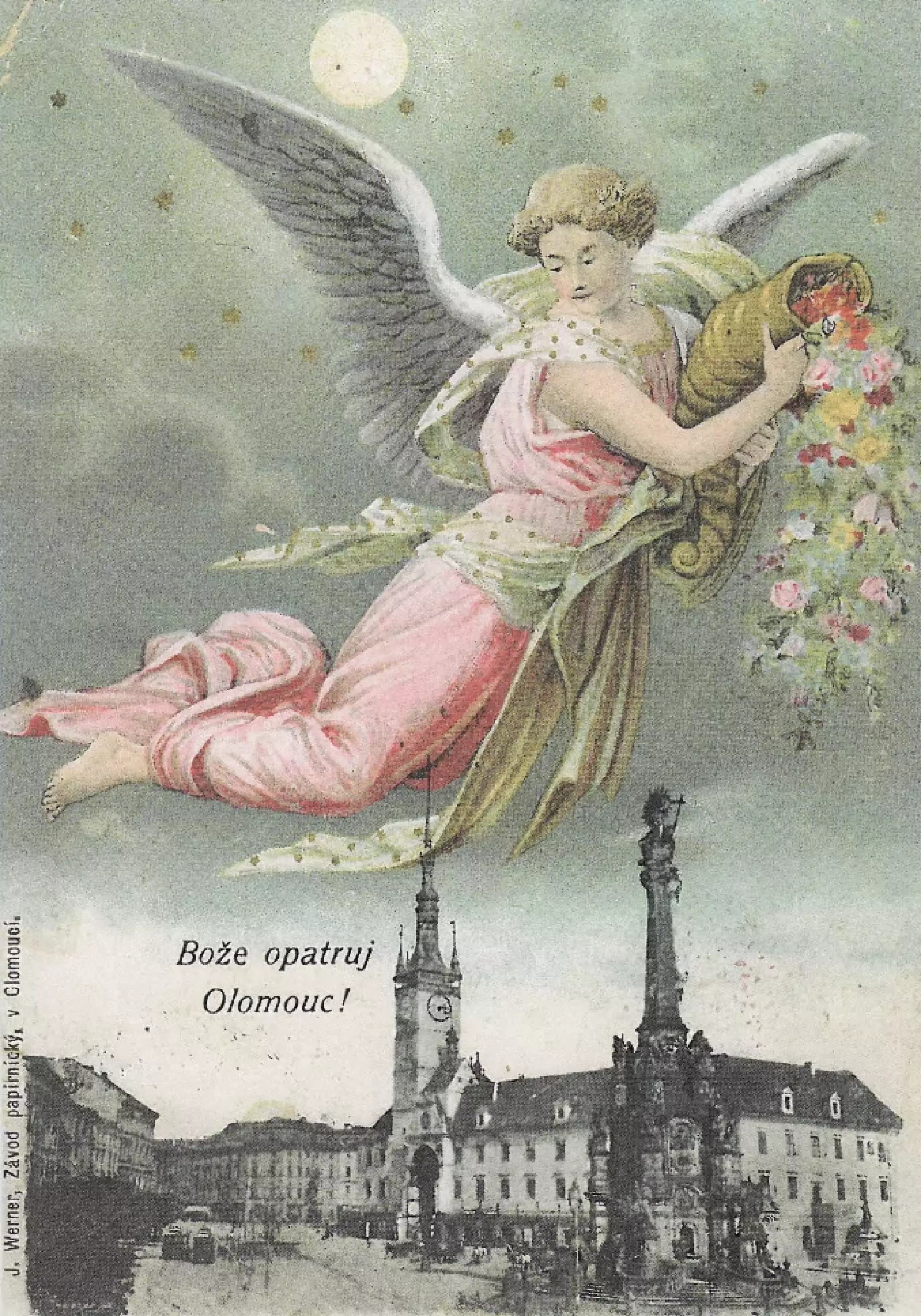 Dopisnice vydaná olomouckým papírníkem J. Wernerem, počátek 20. století. Horní náměstí v Olomouci s pomníkem císaře Františka Josefa I., vybudovaném roku 1898 v blízkosti vstupu do radniční budovy. Soukromá sbírka.