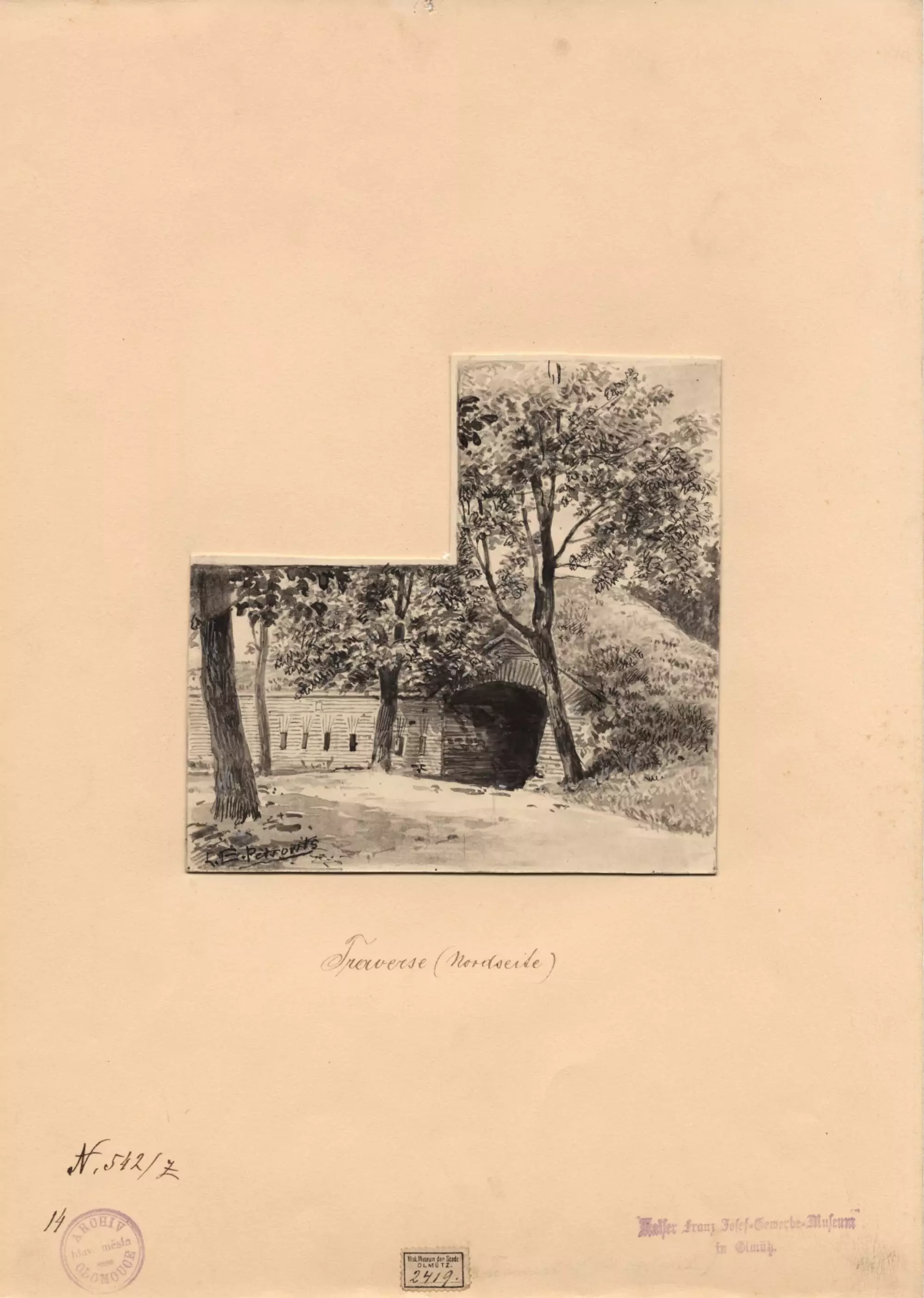 Ladislav Eugen Petrovits (1839–1907): Traverza (krytá spojovací chodba) v opevnění na severní straně města. Lavírovaná kresba z roku 1894. Státní okresní archiv v Olomouci, Archiv města Olomouce, fond M 8-34, inv. č. 243