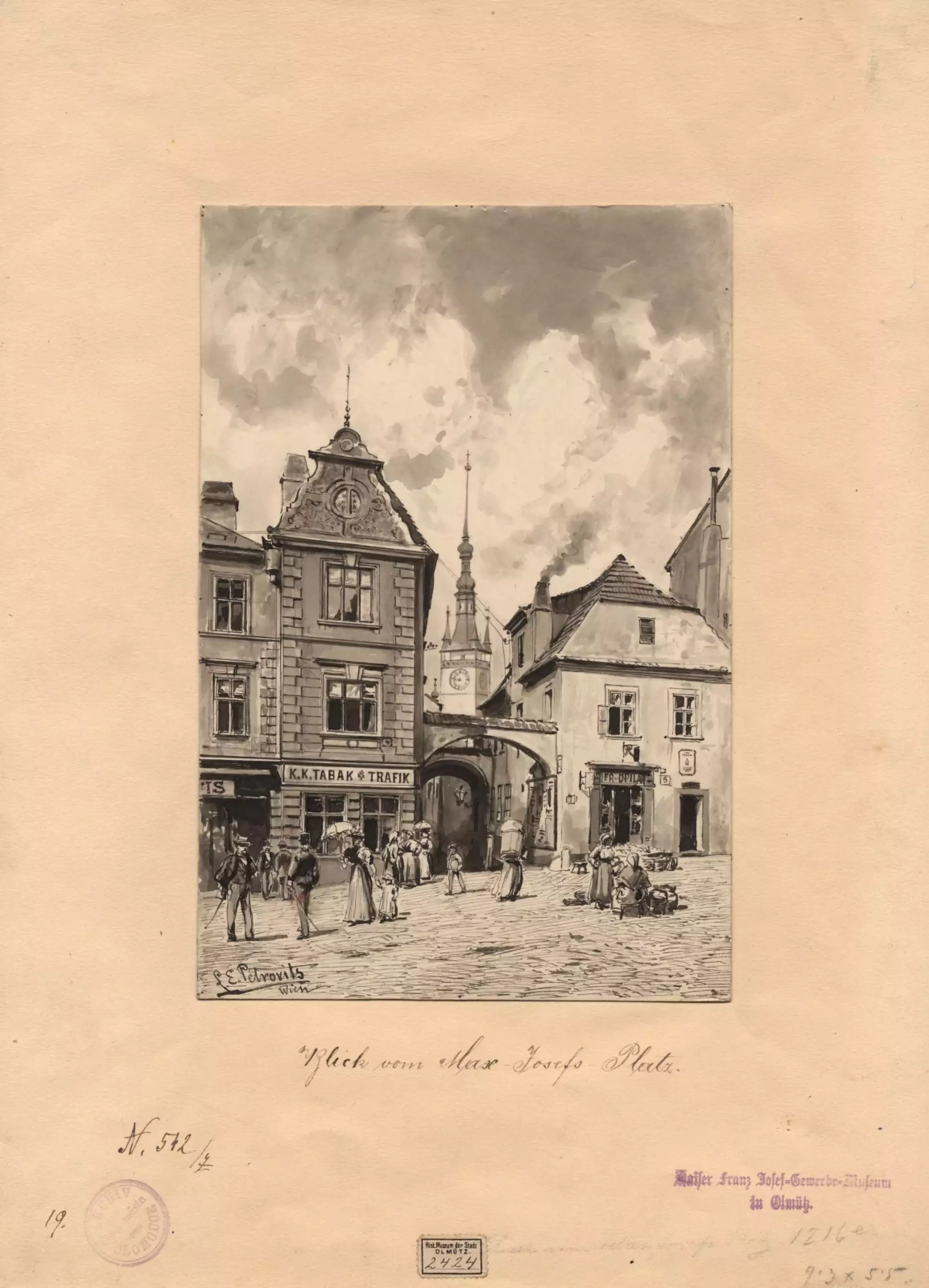 Pohled z náměstí Maxe Josefa (tj. z nynějšího Žerotínova náměstí). Lavírovaná kresba z roku 1894. Státní okresní archiv v Olomouci, Archiv města Olomouce, fond M 8-34, inv. č. 248.