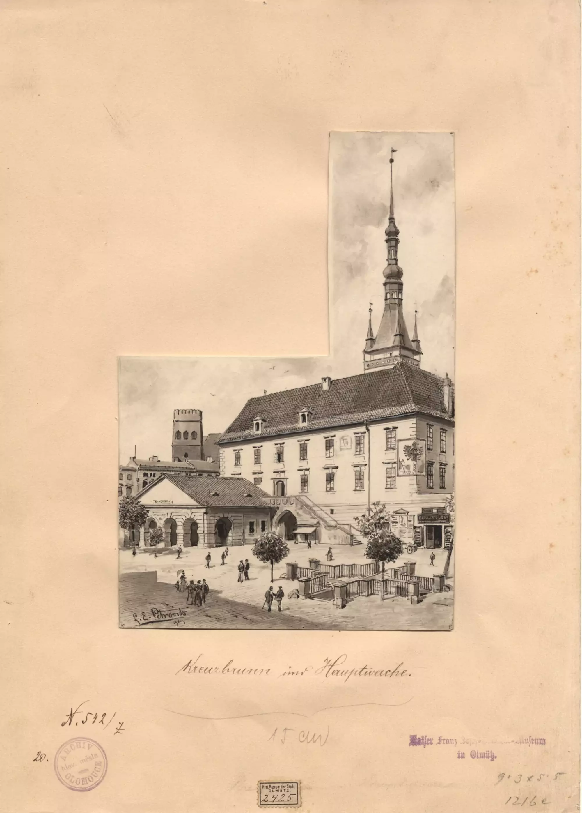Ladislav Eugen Petrovits (1839–1907): Křížový pramen a hlavní strážnice (na Horním náměstí). Lavírovaná kresba z roku 1894. Státní okresní archiv v Olomouci, Archiv města Olomouce, fond M 8-34, inv. č. 249.