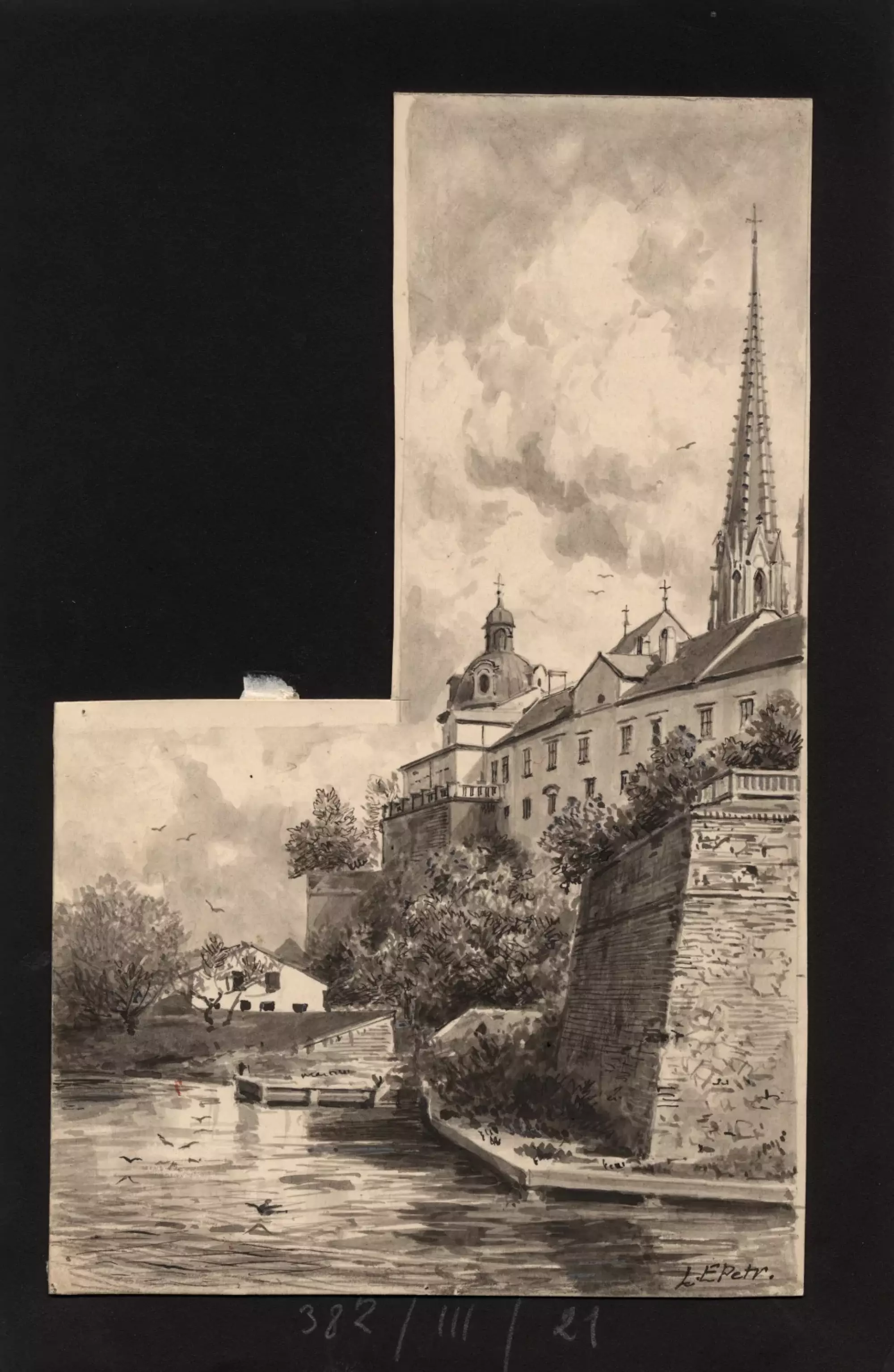Ladislav Eugen Petrovits (1839–1907): Pohled na kapitulní děkanství (nyní Arcidiecézní muzeum) a katedrálu sv. Václava. Lavírovaná kresba z roku 1894. Státní okresní archiv v Olomouci, Archiv města Olomouce, fond M 8-34, inv. č. 250.